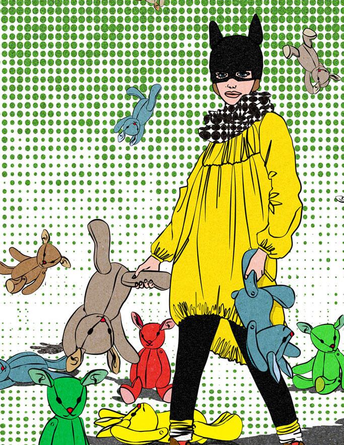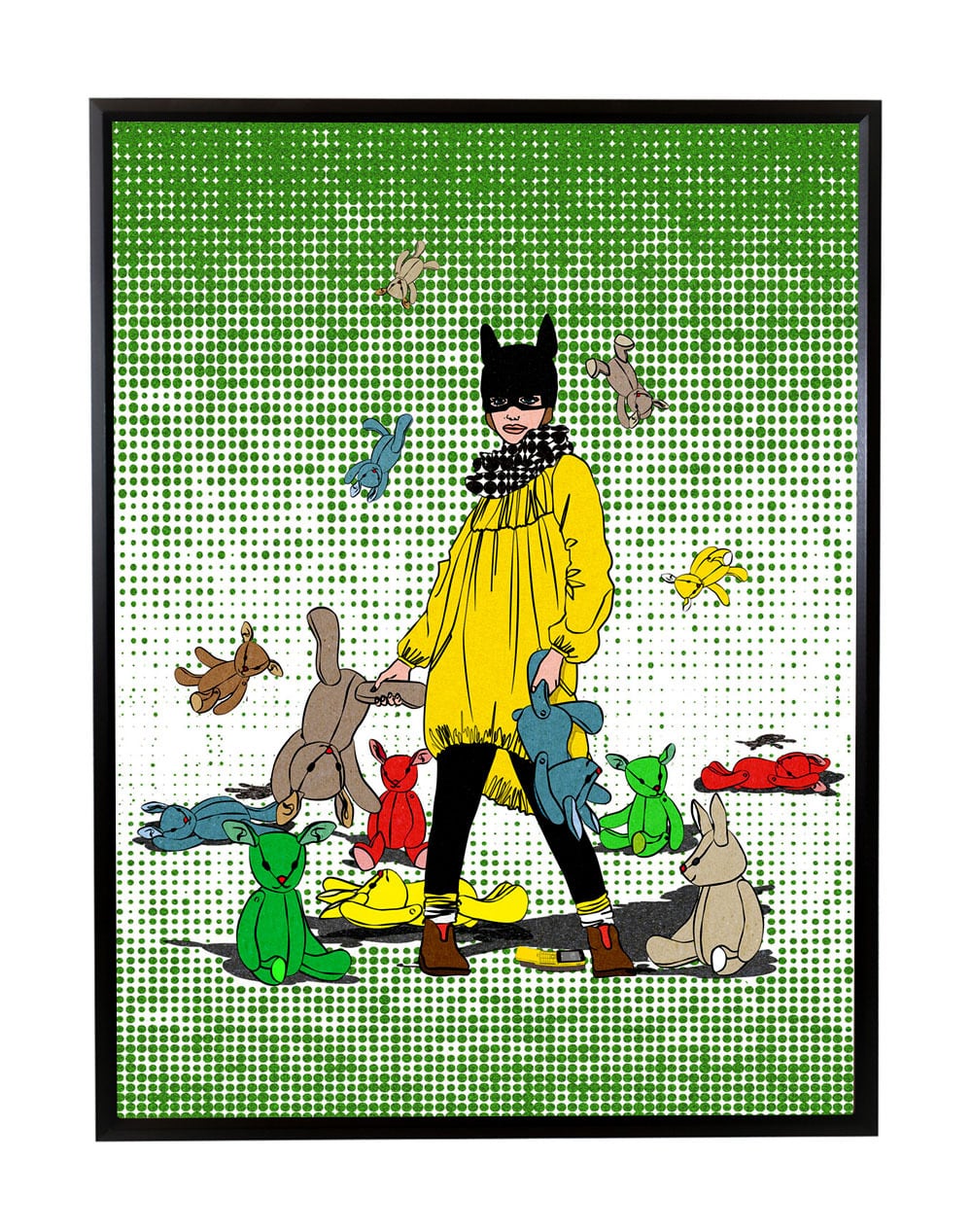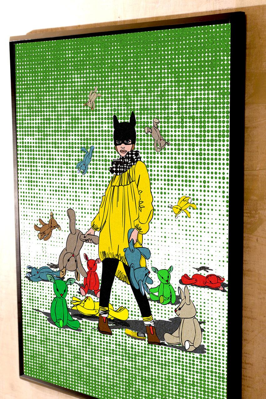 商品名『KUMATRIX_NO.34 / イラスト アート ART インテリア』は、テディベアを操るエージェントの少女が活躍する、仮想世界『クマトリクス』を表現したイラストアート作品です。映画マトリクスのようなデジタルワールドを感じさせ、壁掛けとしてもおしゃれなインテリアとしても最適です。 本作品は、デジタルイラストの技法を用いた作品であり、そのクオリティは高く、色使いや構図にも特徴があり、一度見たら忘れられないインパクトがあります。