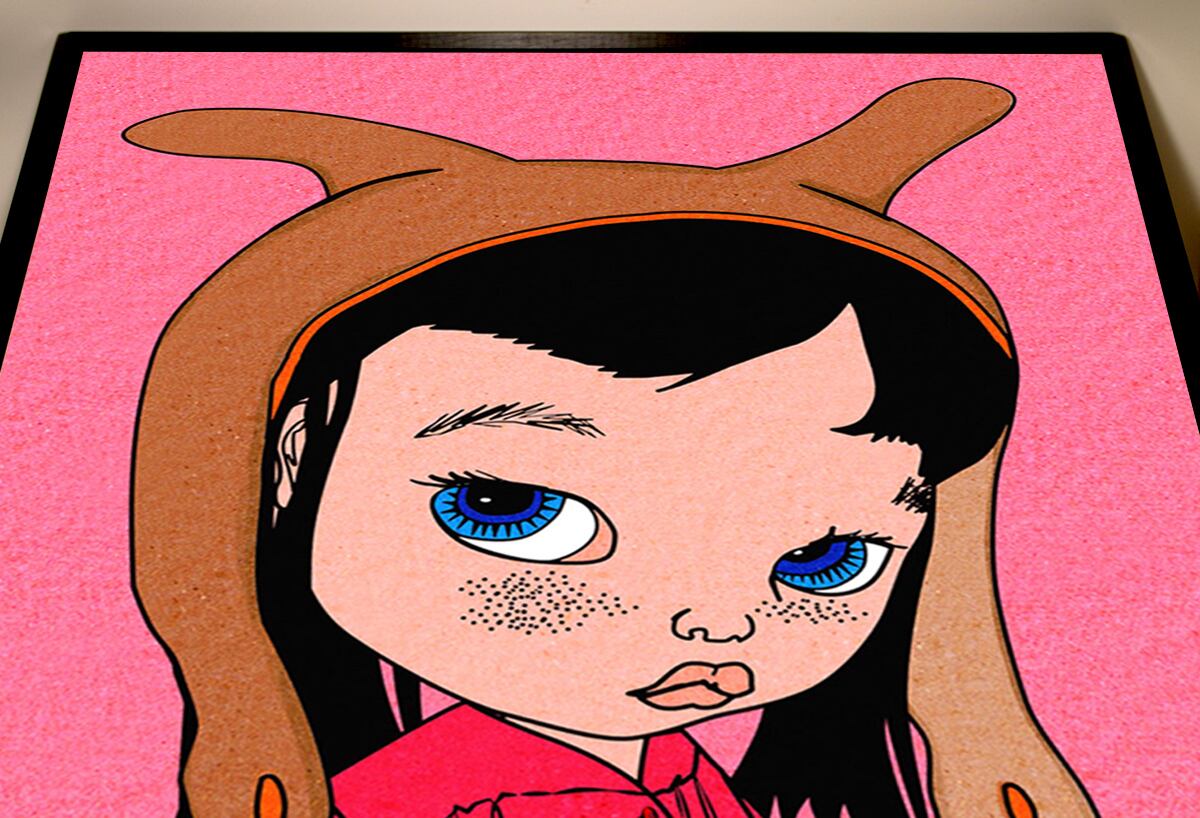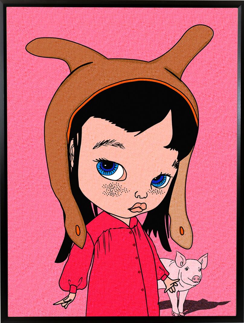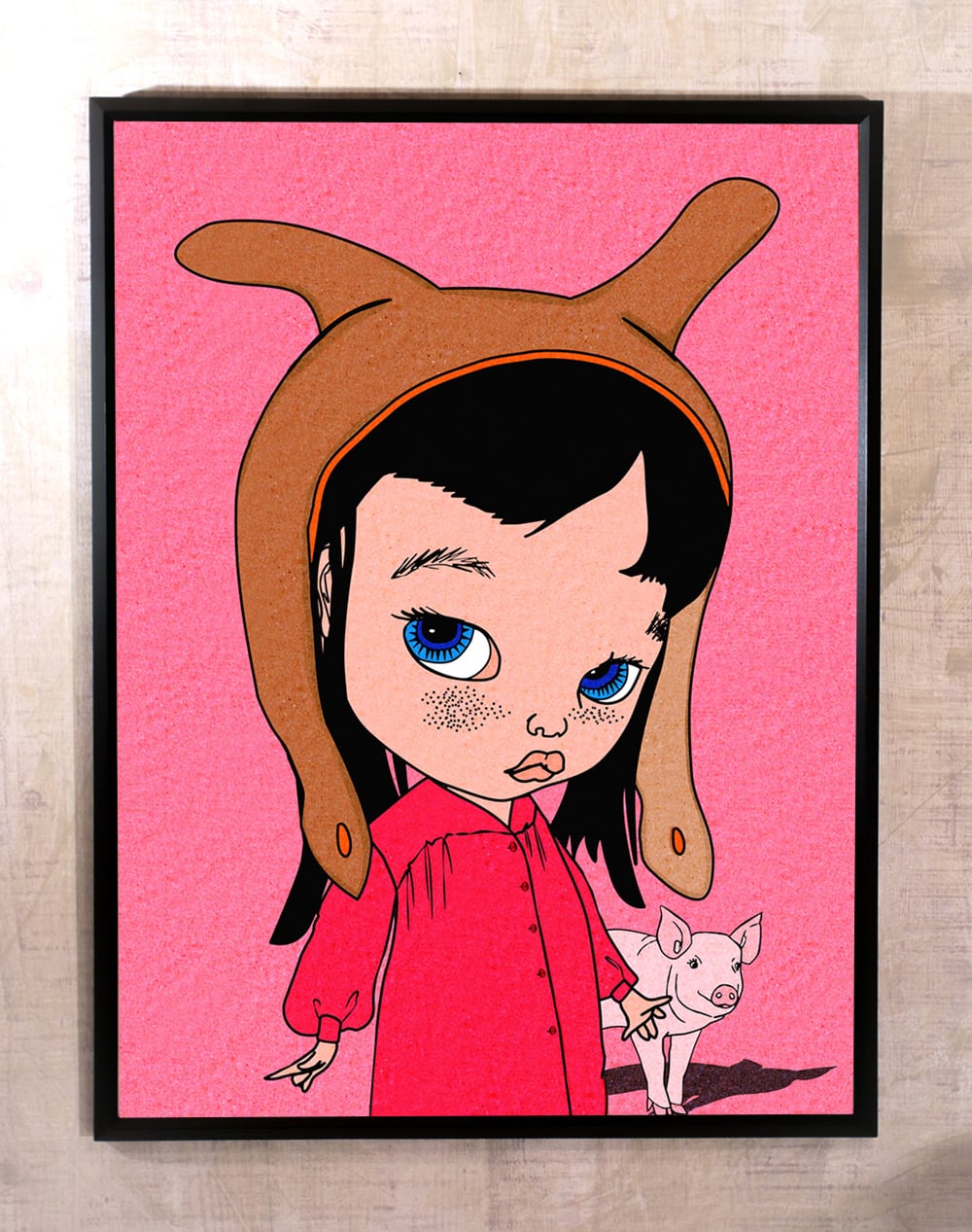デジタルイラストで描かれたこの作品には、幼少時のとてもかわいかったであろうアニーを作家の想像で描いています。 そして、何より目を引くのは、後ろから覗く豚のキュートさ、ちょっとブサカワなキャラクターをお気に入りのスペースに飾って、インテリアのアクセントにしてみませんか?もちろん、ブライスドールコレクションのファンの方も、欠かせないアイテムですよ。