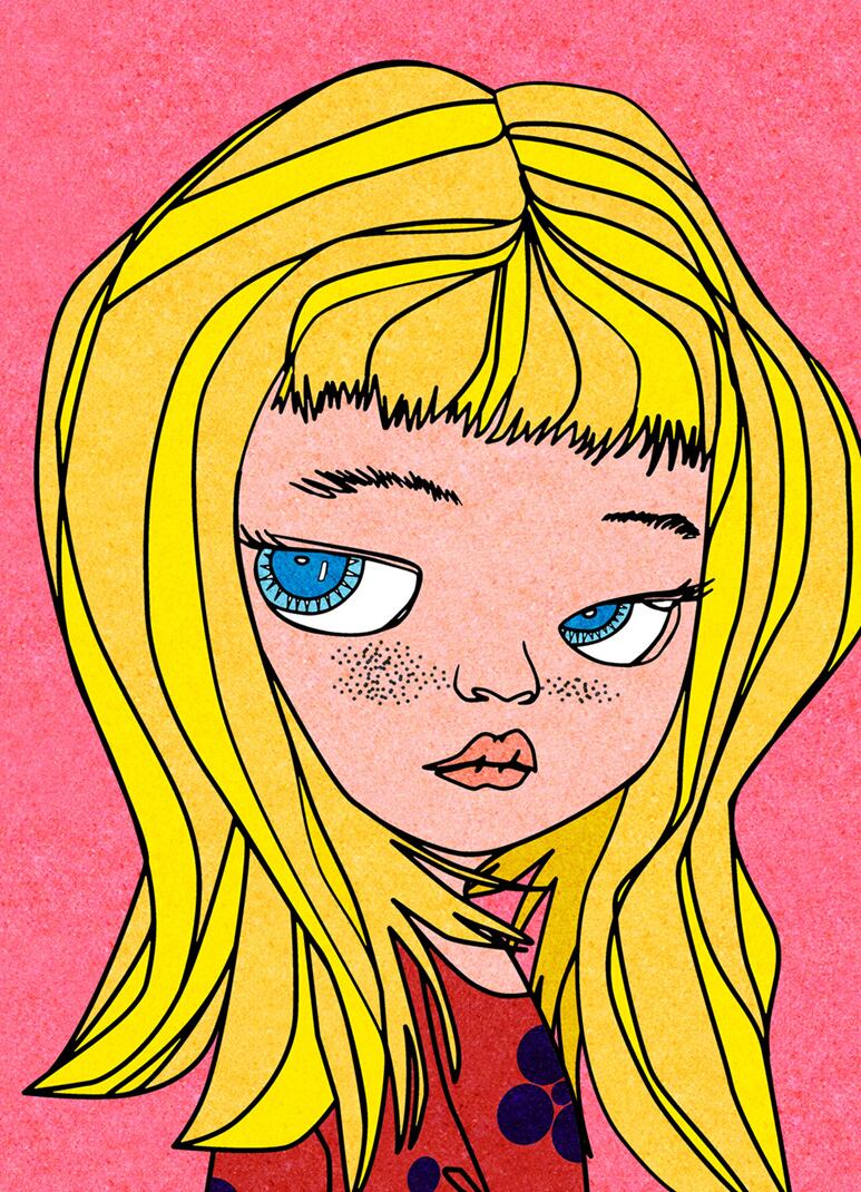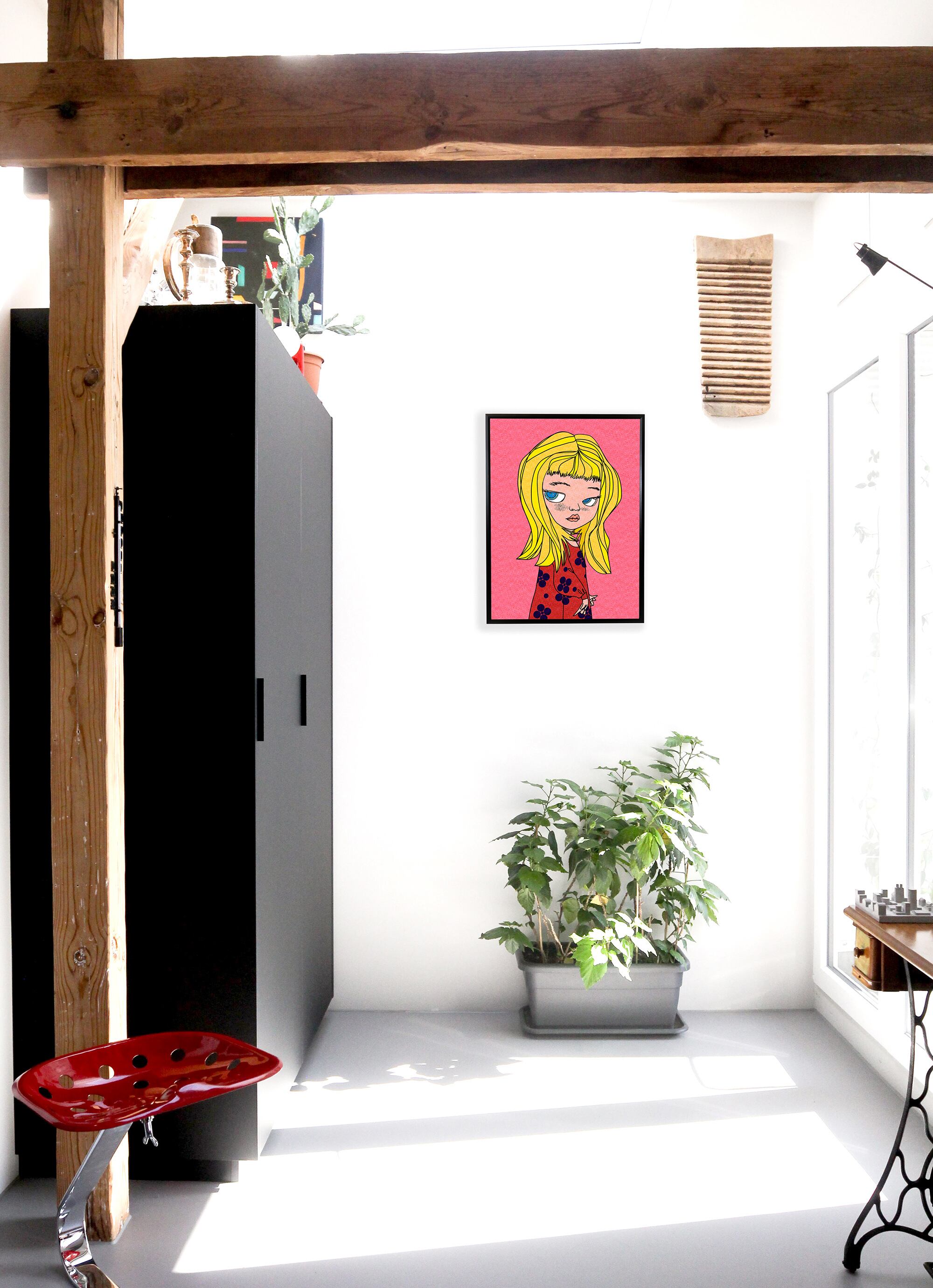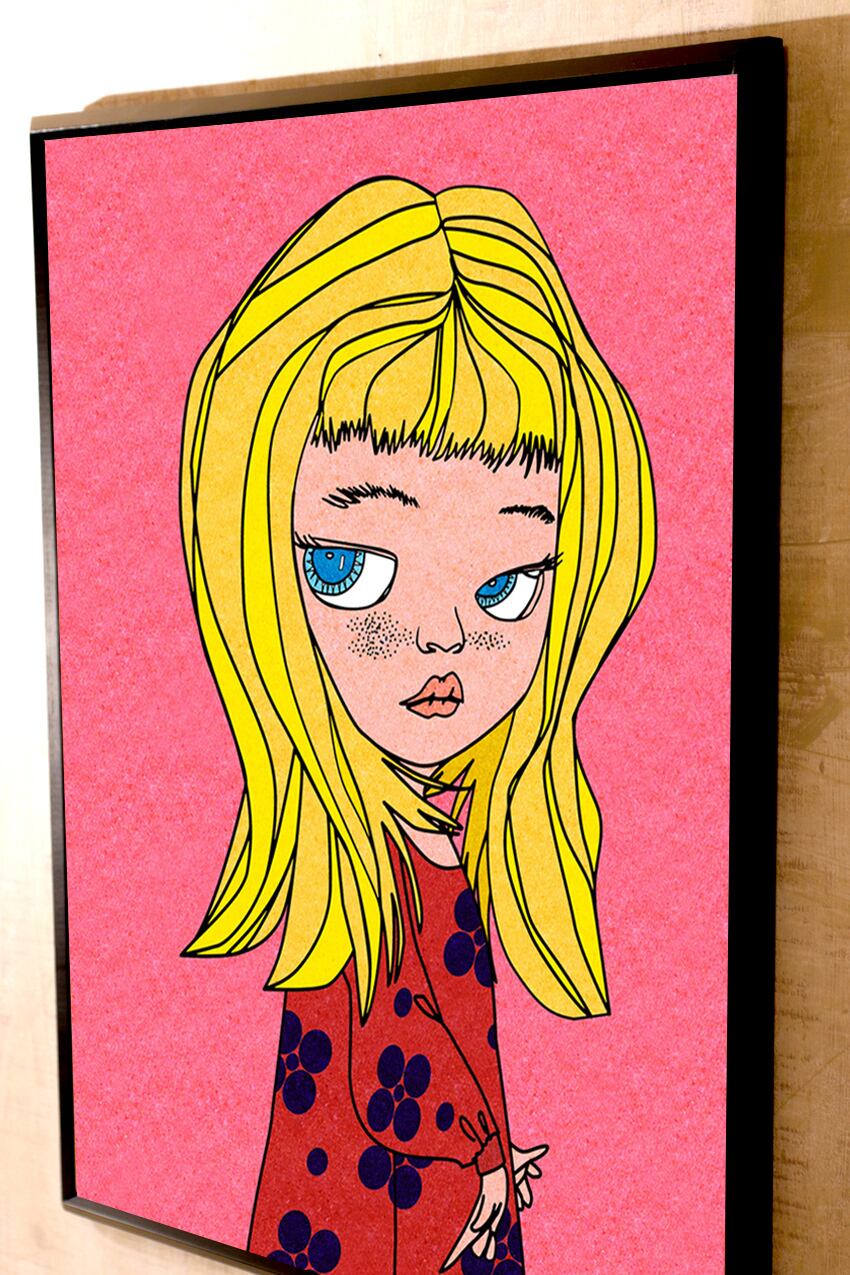 鮮やかなピンク色の背景に、髪のイエローや瞳のブルーがよく映える、とってもキュートな少女が描かれたデジタルイラスト作品です。大切なお部屋を、この可愛らしいアートで飾りましょう。
