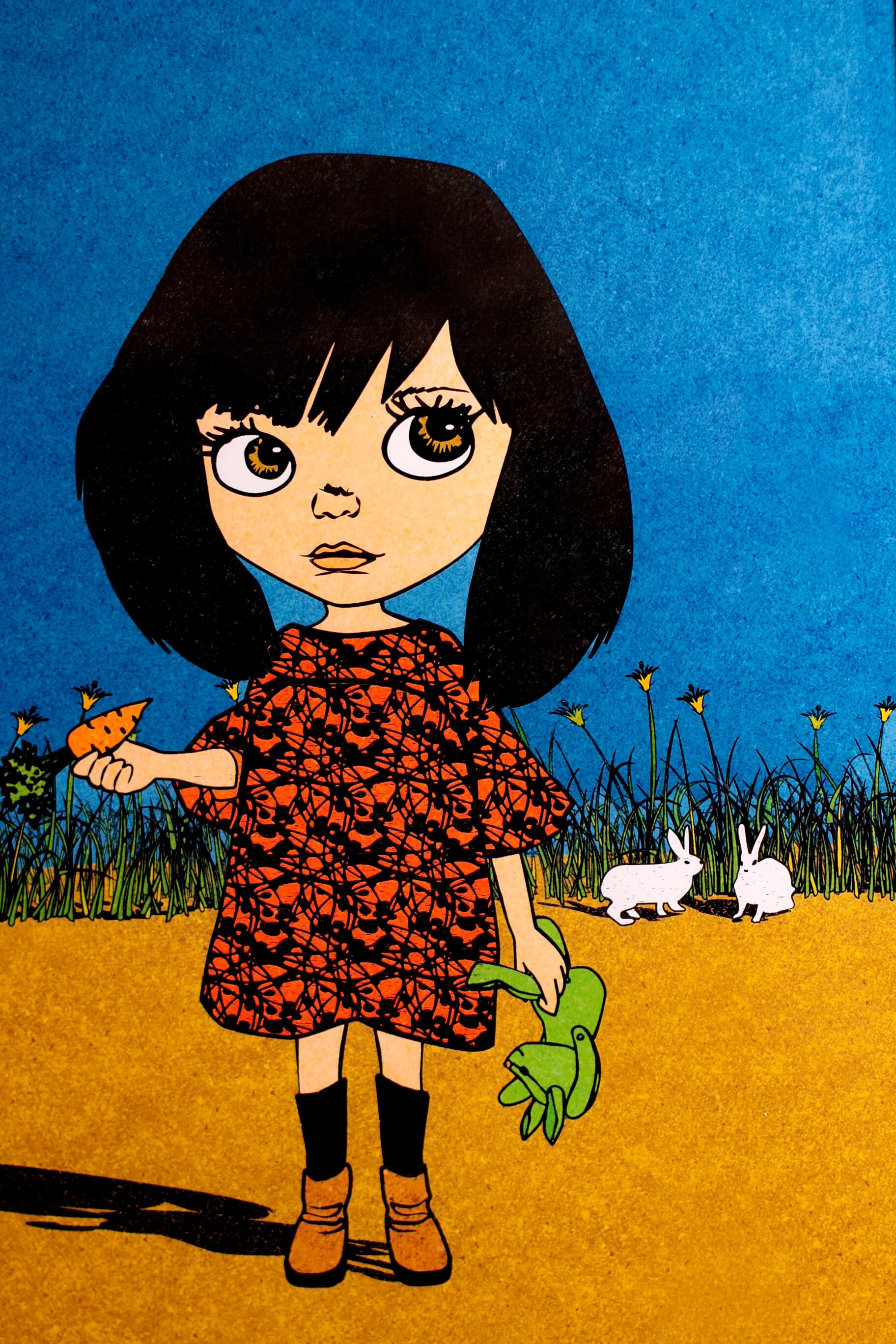 うさぎのぬいぐるみとにんじんを持ち、佇む少女。個性的な柄のワンピースや、くりっとした大きな目がとってもキュートです。