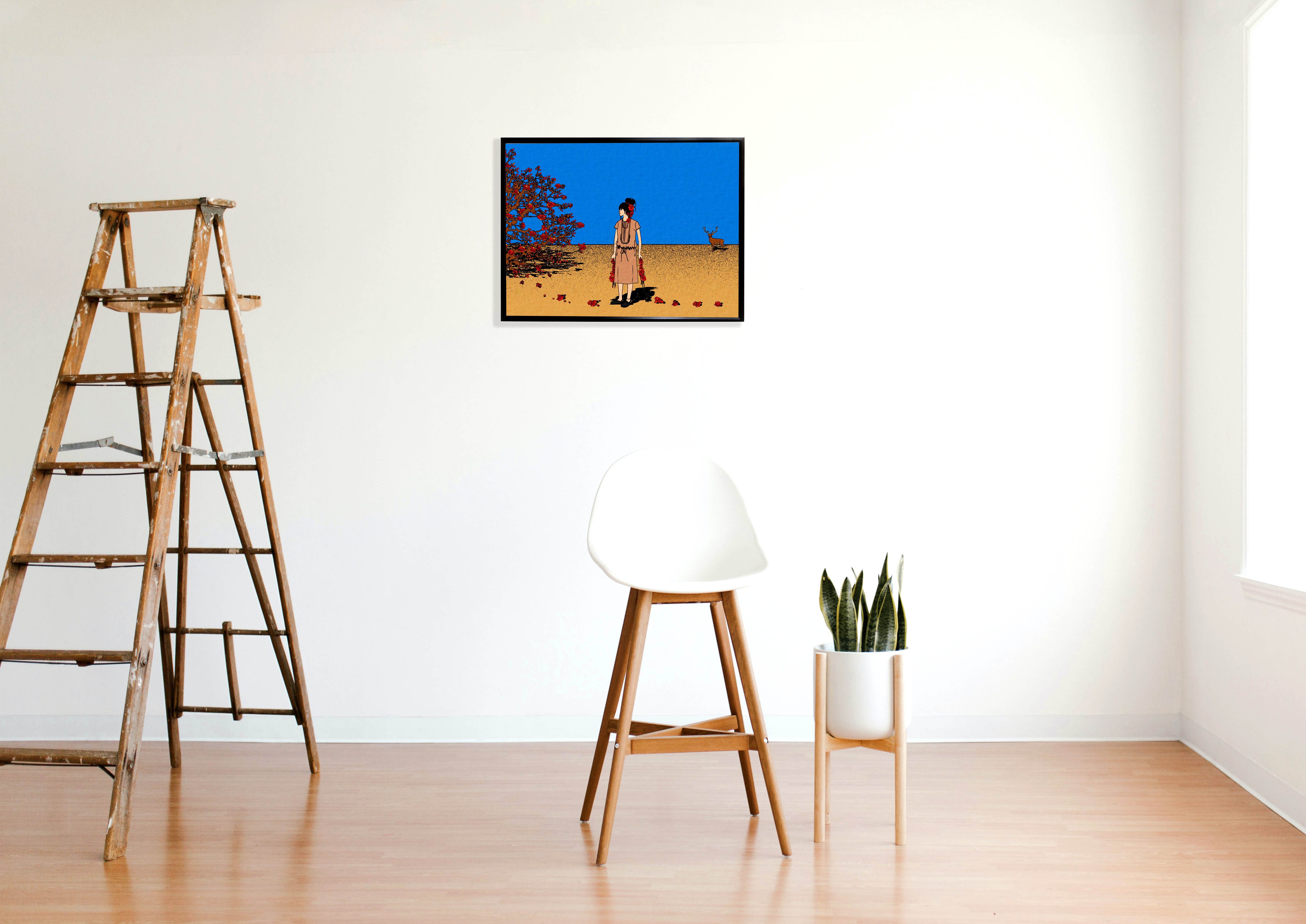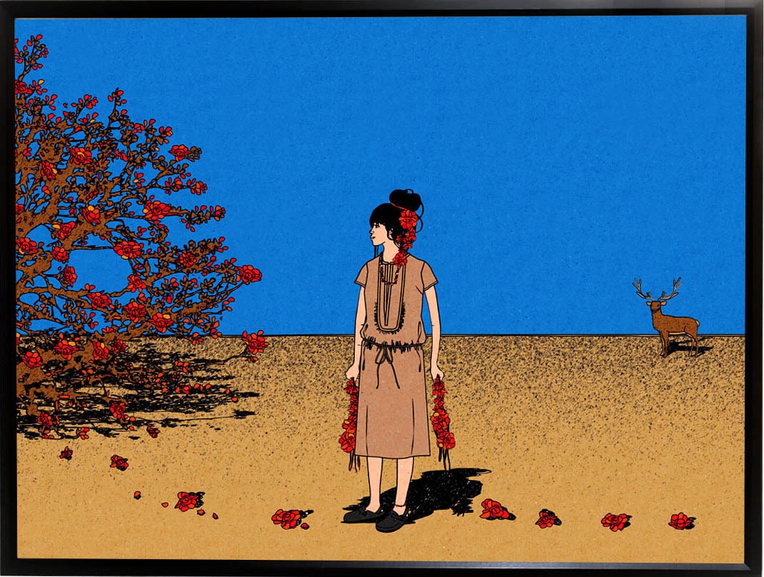 この作品は、あなたのお部屋を彩るインテリアとして最適です。花と少女をモチーフにしたアートは、幻想的でストーリー性があり、見る人を引き込みます。また、濃密な色彩で表現されたイラストは、壁に飾っていただくだけで空間を引き締め、非日常的な雰囲気を演出します。