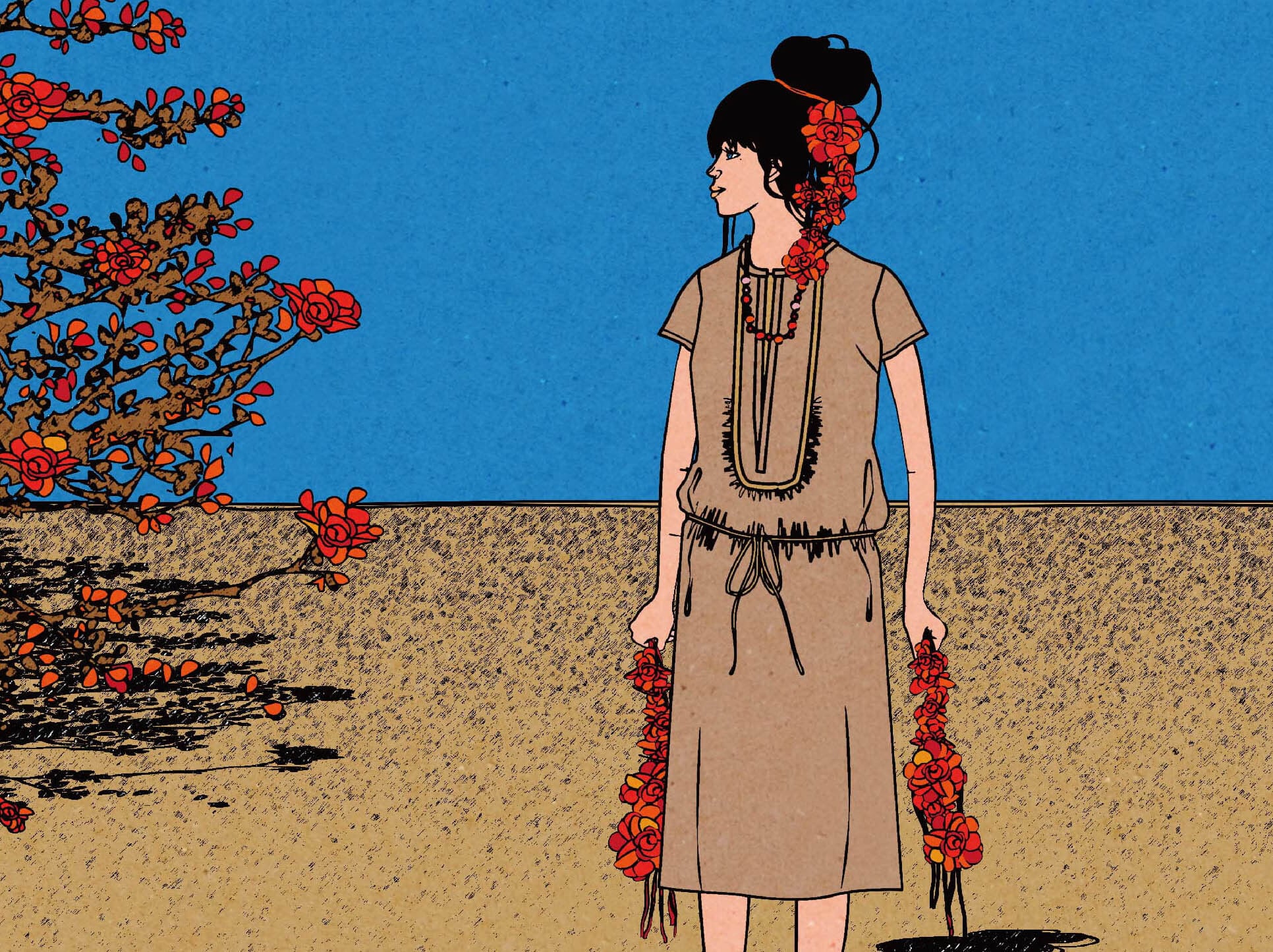 荒野に咲く美しい花がモチーフの「Flowers in the wilderness NO.80」。砂漠のような厳しい環境でもたくましく生き続ける花をつけた樹木が印象的です。イラストはデジタルで描かれ、鮮やかで奥深い色合いが特徴的です。