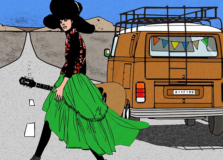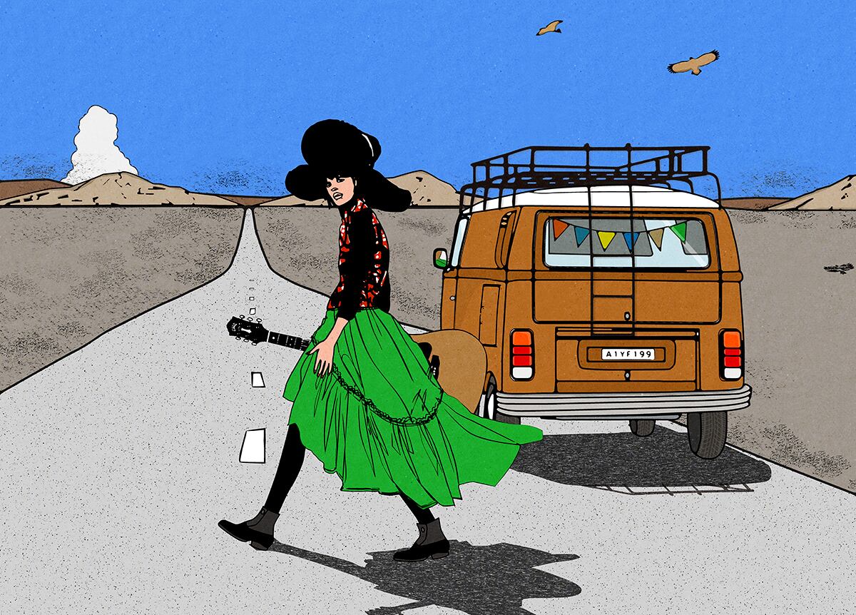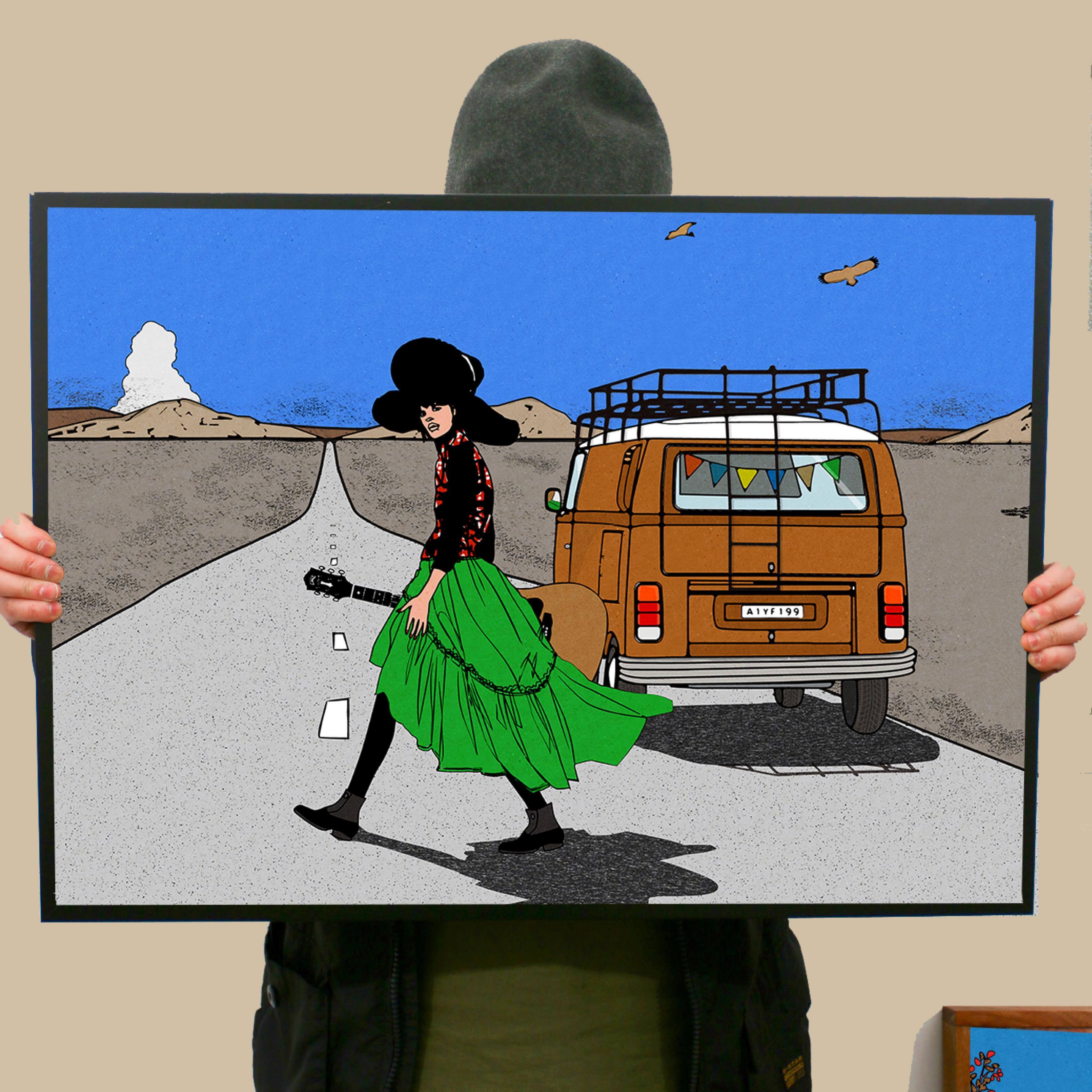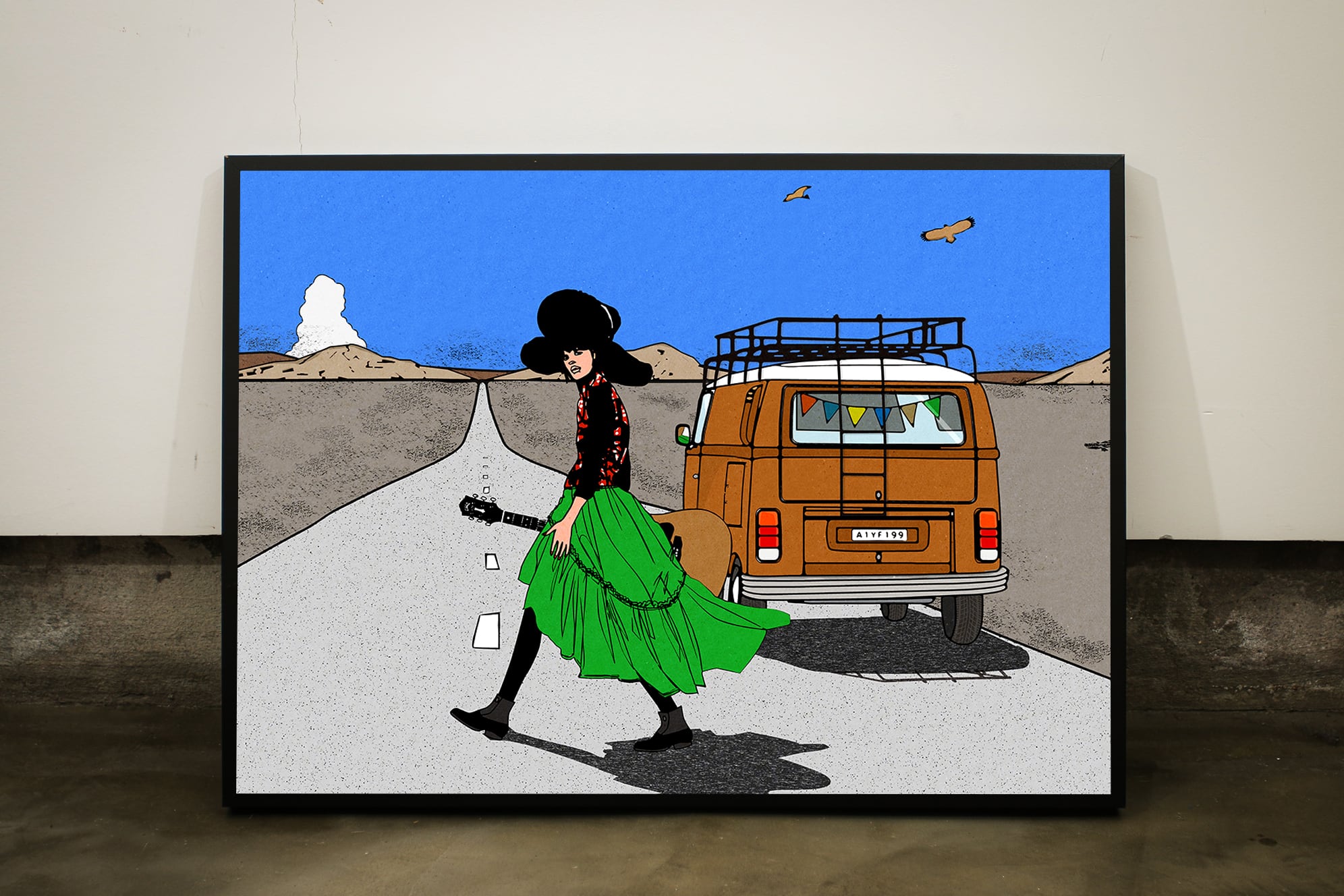 「Unplugged music NO.95」は、美しいブルーの空とツアーバスをイメージした鮮やかなイラスト作品です。少女が大人になり、Musicianとして旅をする様子を表現しています。