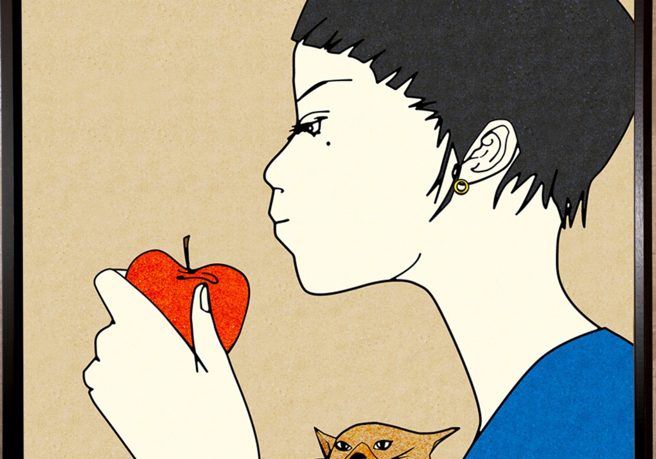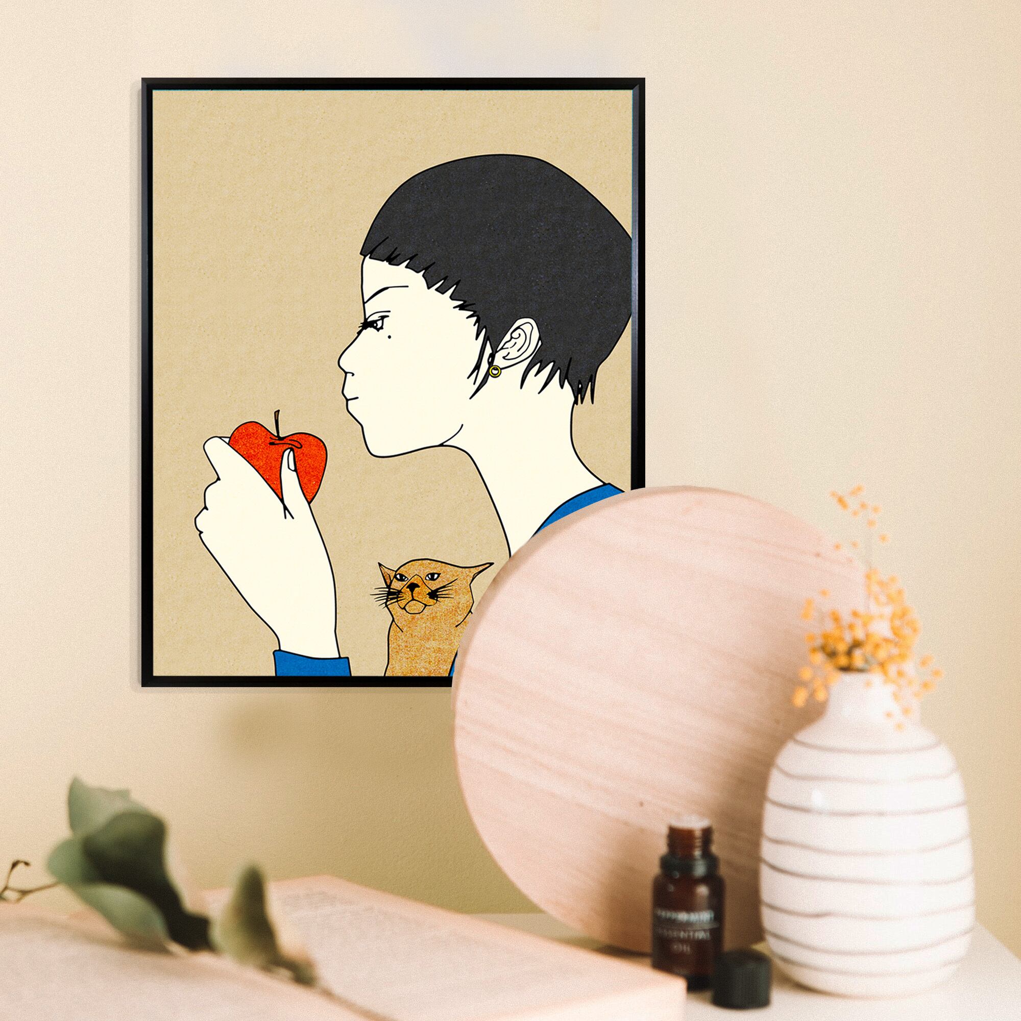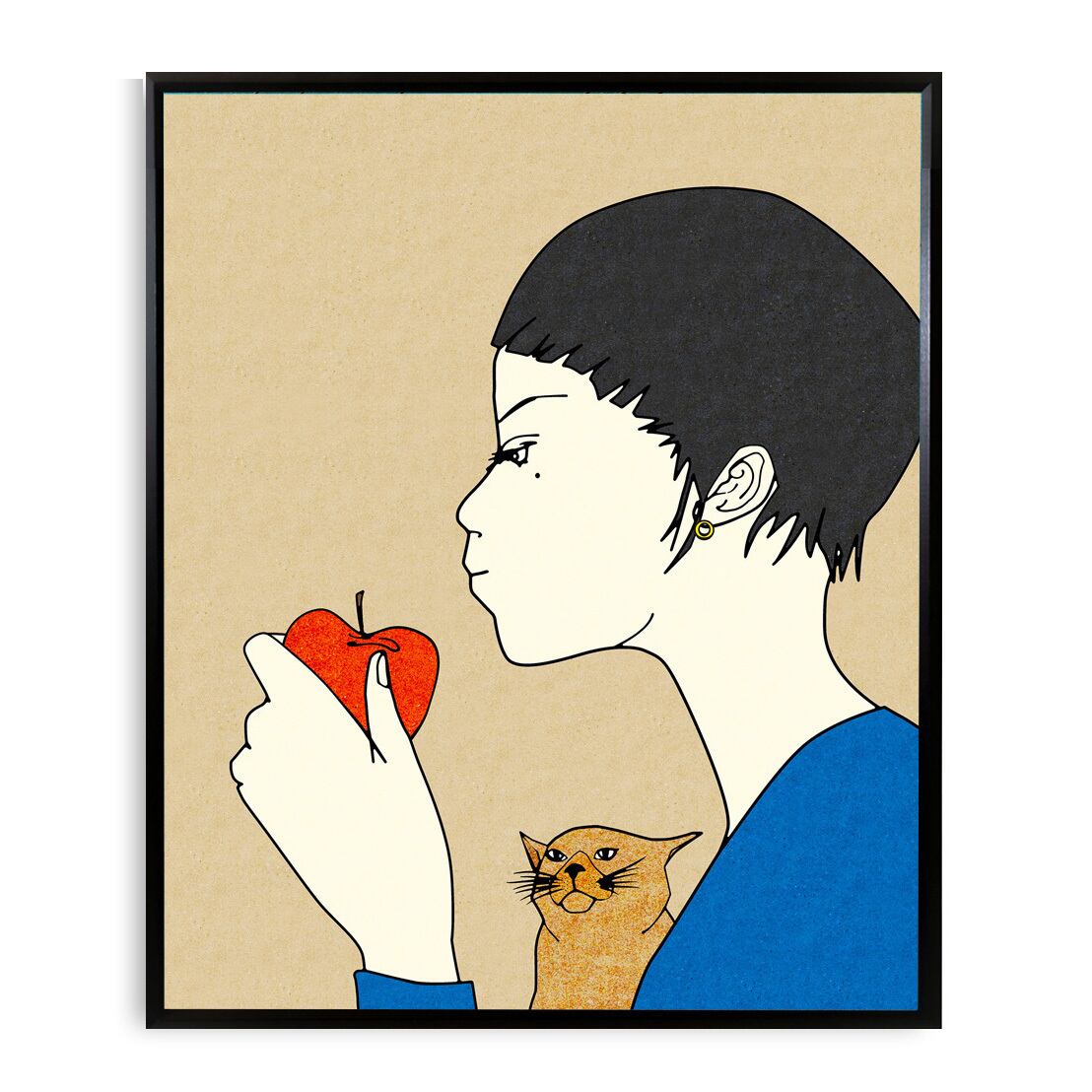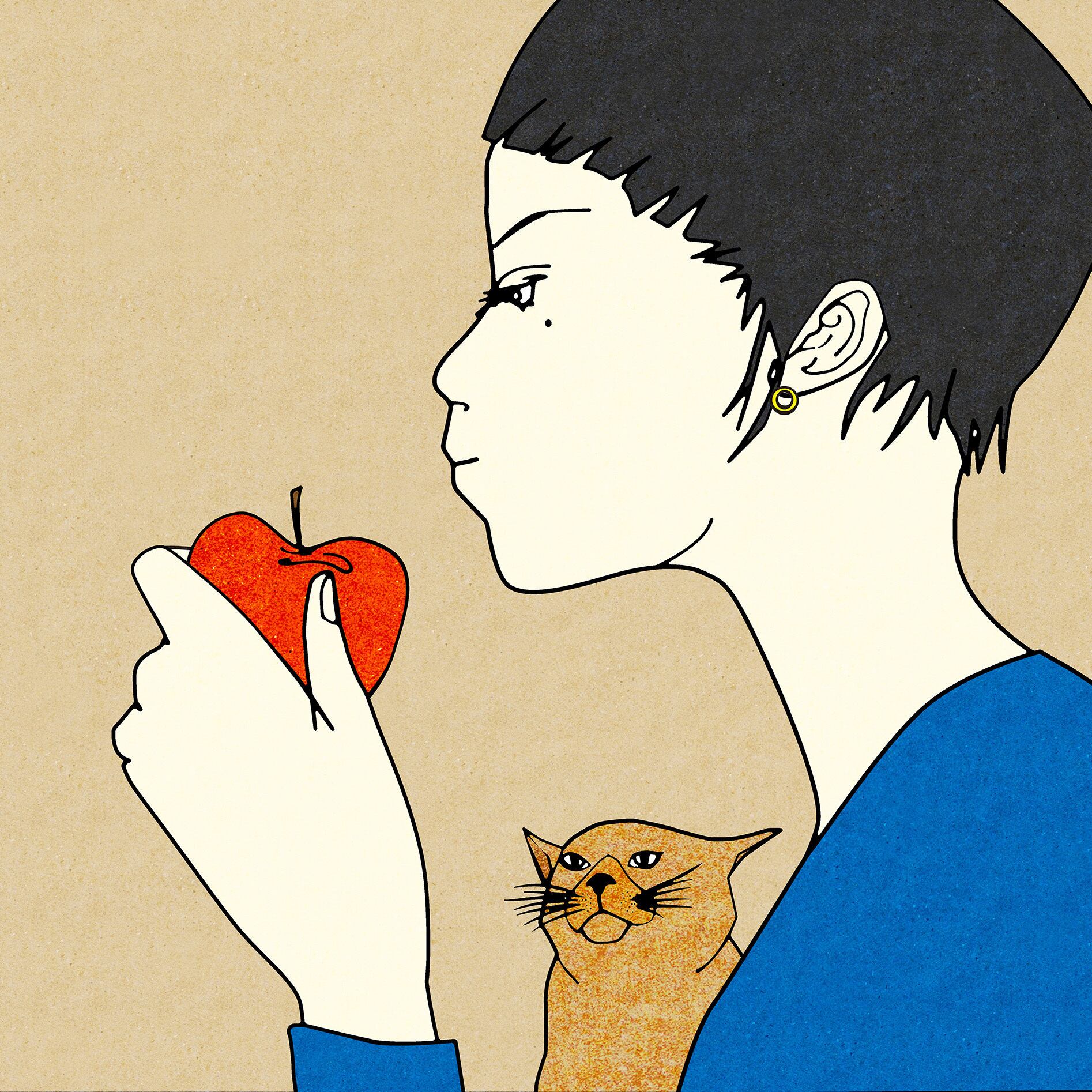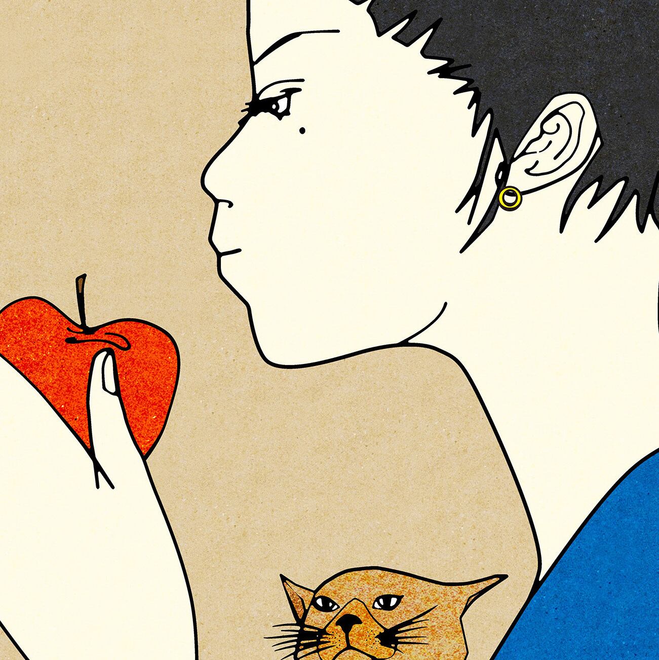 りんごを握りしめ、悩める女性と、それを見つめる愛らしい猫を描いたイラスト作品です。