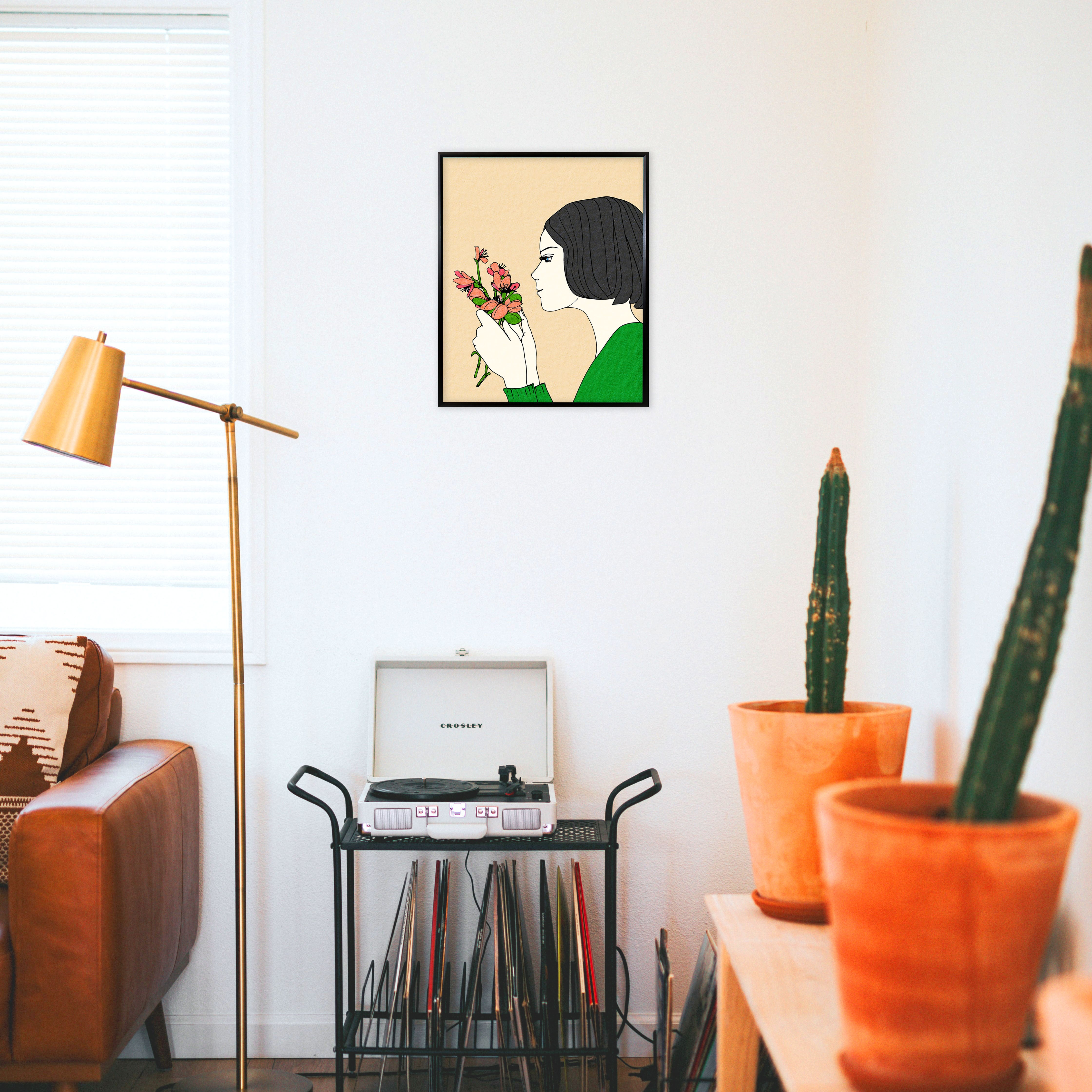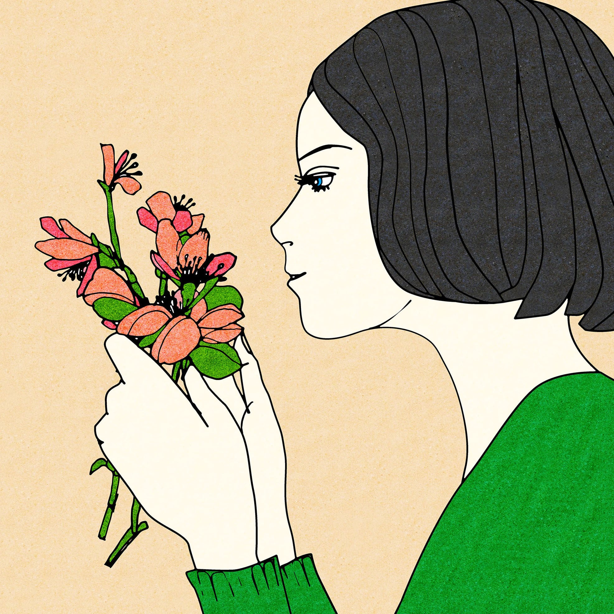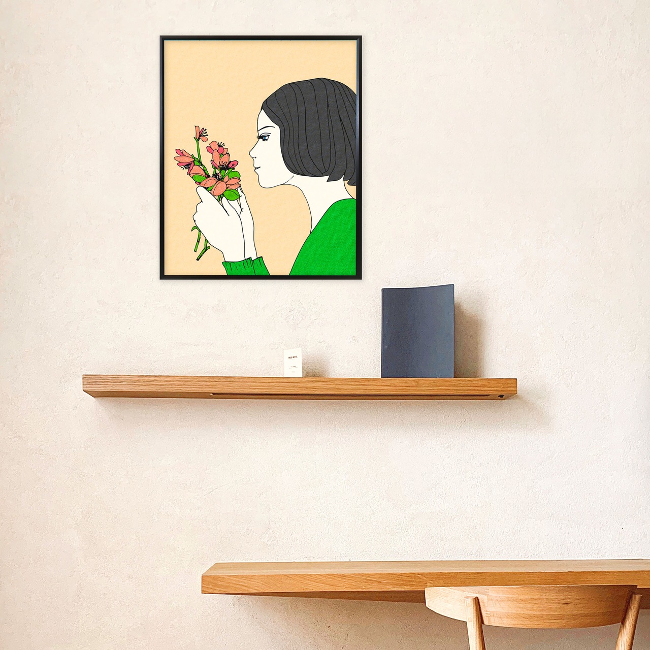 「Flower Scent #01 No.124」は、女性が花を持ち、グリーンの服を着た美しいイラスト作品です。温かみのある色使いと手描き風のタッチが特徴的。お部屋のインテリアとして飾るだけでなく、贈り物やプレゼントにもおすすめです。
