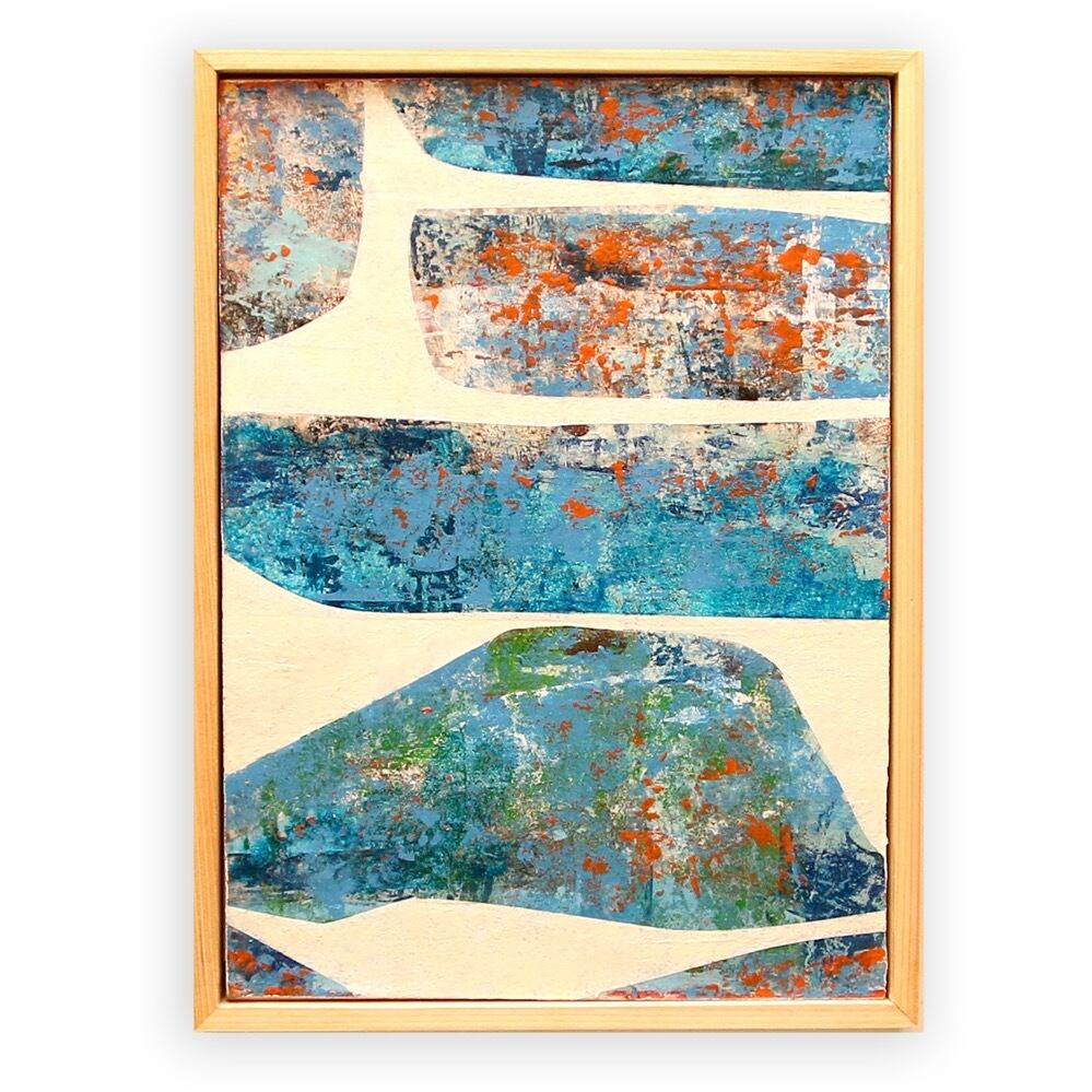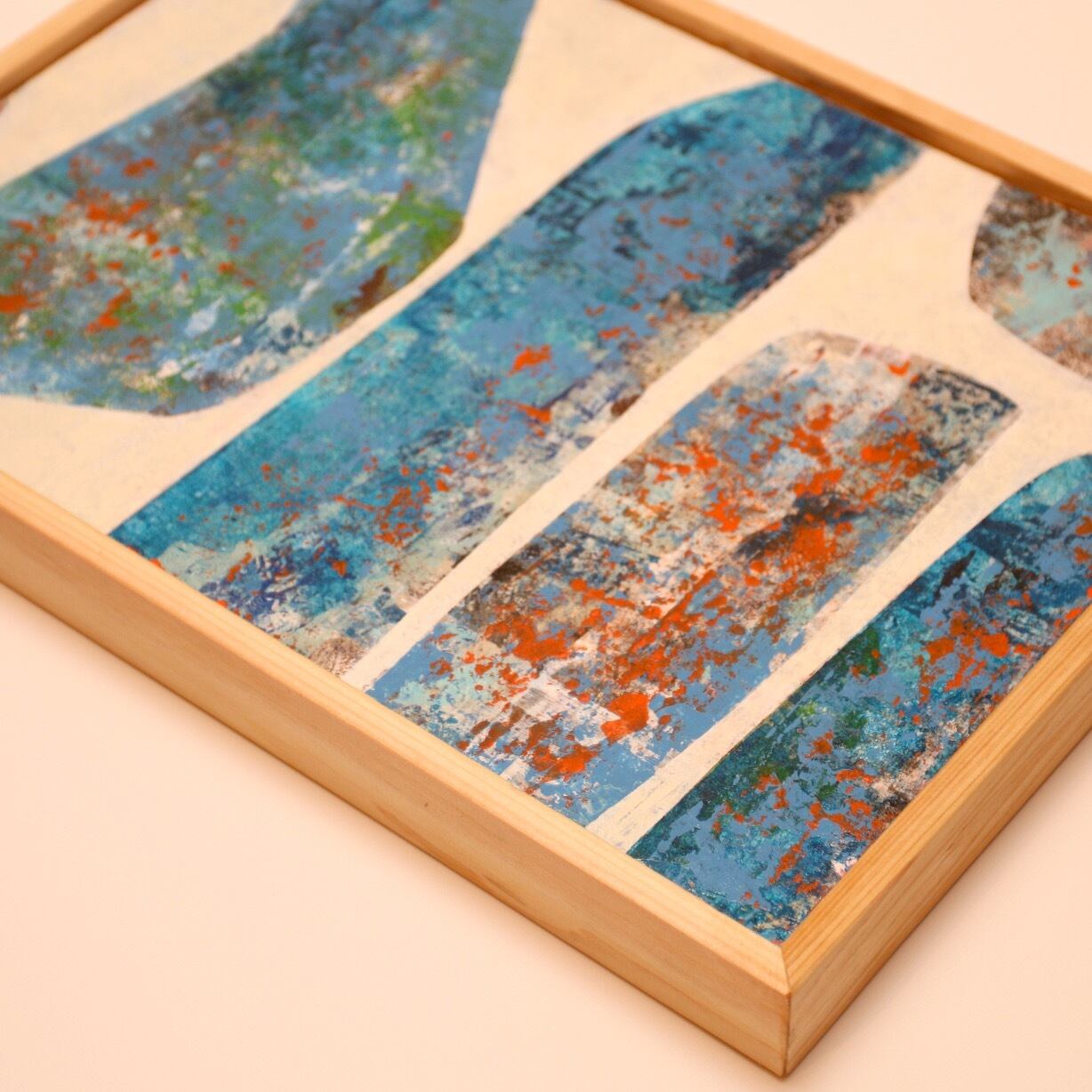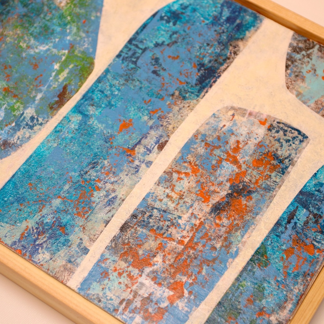 アクリル画で青緑とブルーを基調とした色彩の重なりが美しい一枚、Blue green land No.142(青緑の土地)をご紹介します。 この抽象画は、色のグラデーションやポイントカラー、色彩の流れを緻密に計画した結果、美しい青緑色とブルー色を基調とした美しい世界が出来上がりました。さらに、ポイントにオレンジを配置し、視覚的なバランスをとることで、個性的でありながらもバランスの取れた作品に仕上がっています。お部屋に飾れば、清涼感あふれる空間を演出できます。