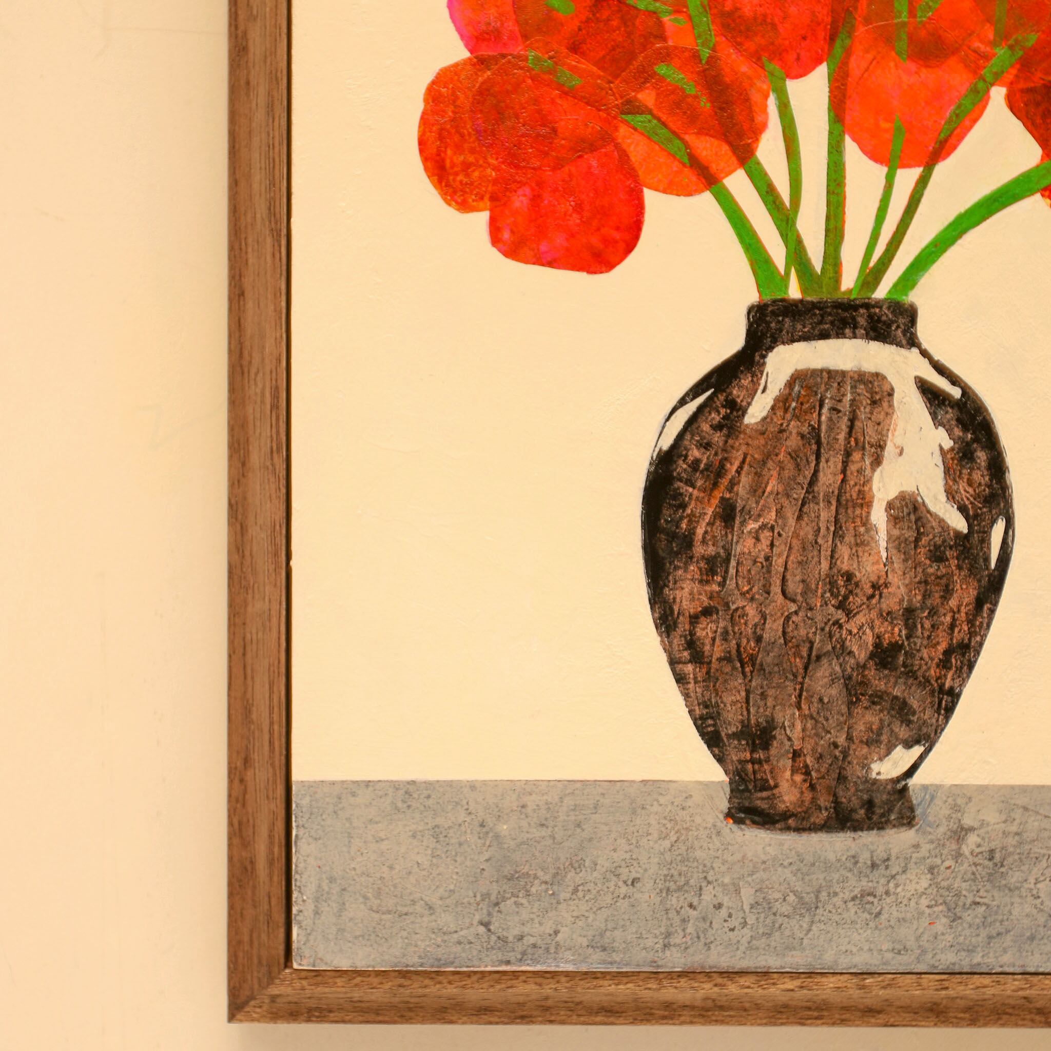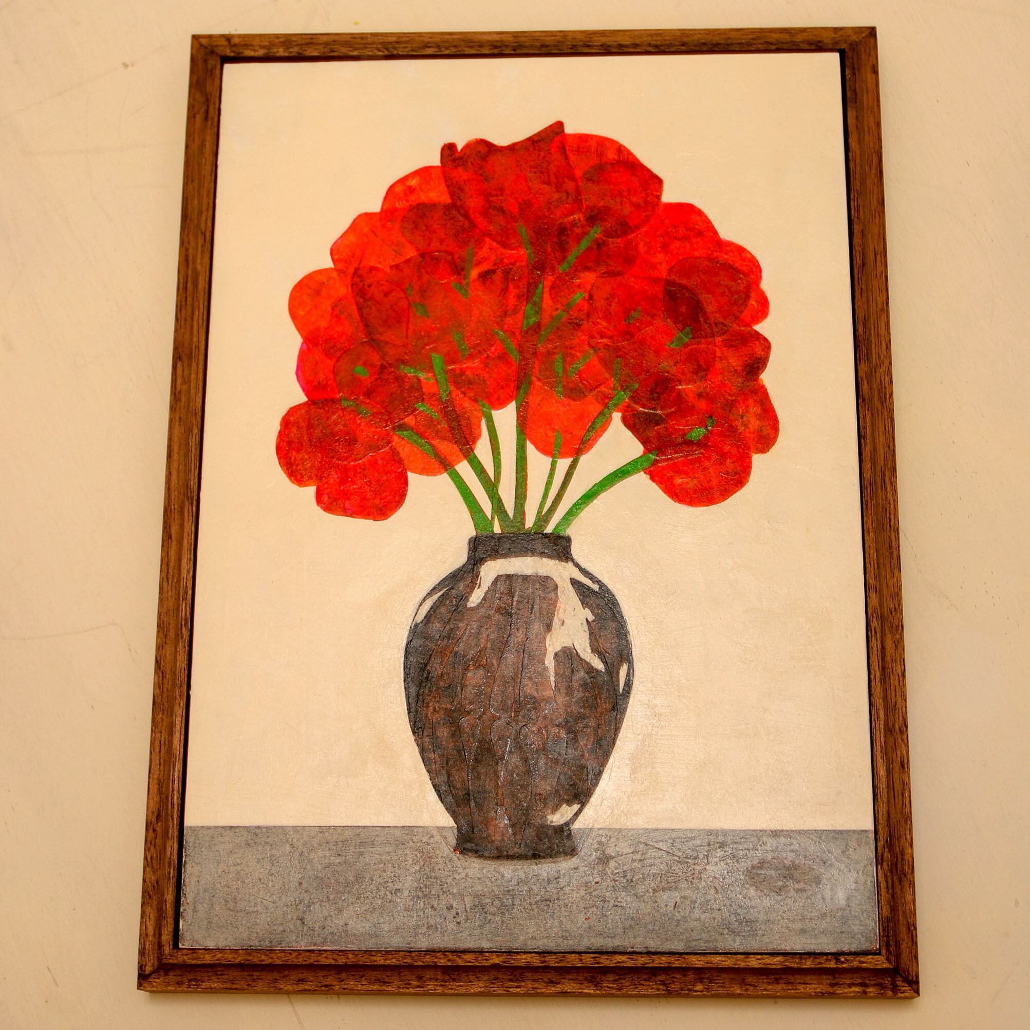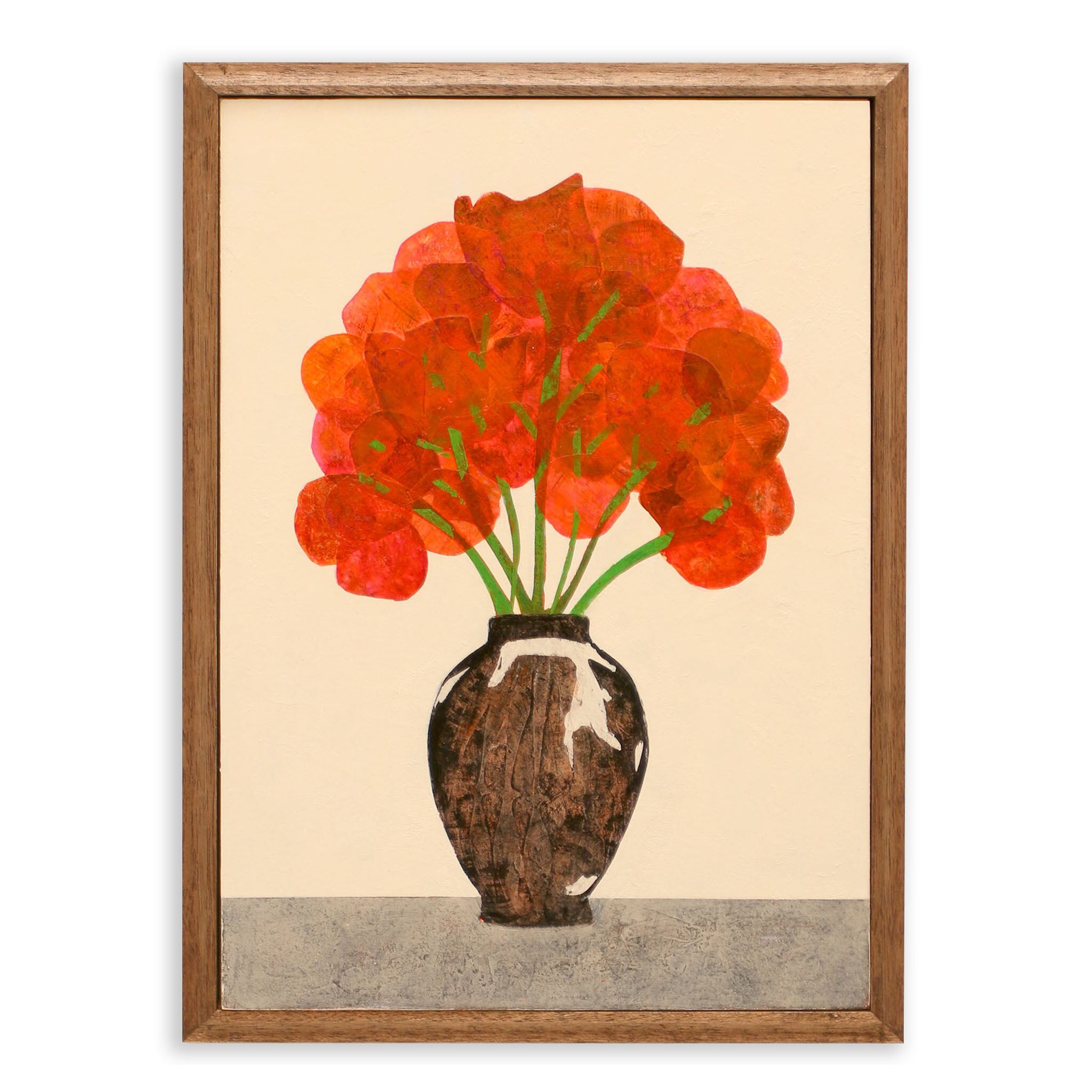 赤、ピンク、オレンジなどの華やかな色合いが鮮やかに表現された抽象的なアクリル絵具作品、Red bouquet_#2_Np.181。抽象的に描かれた花びらの重ねが豪華さを演出します。