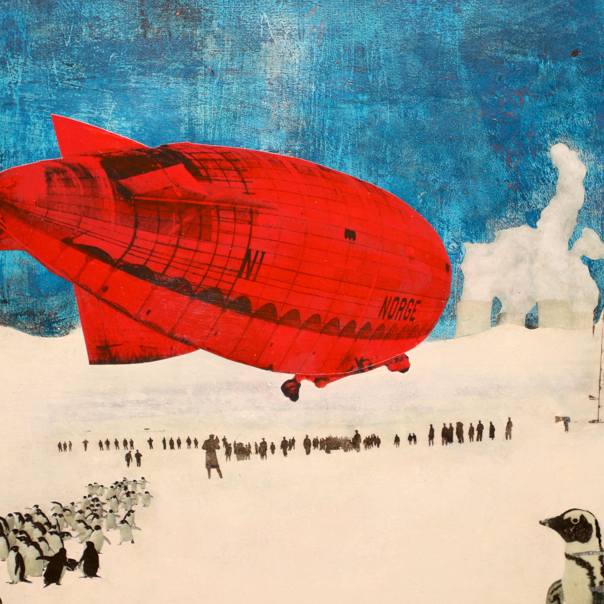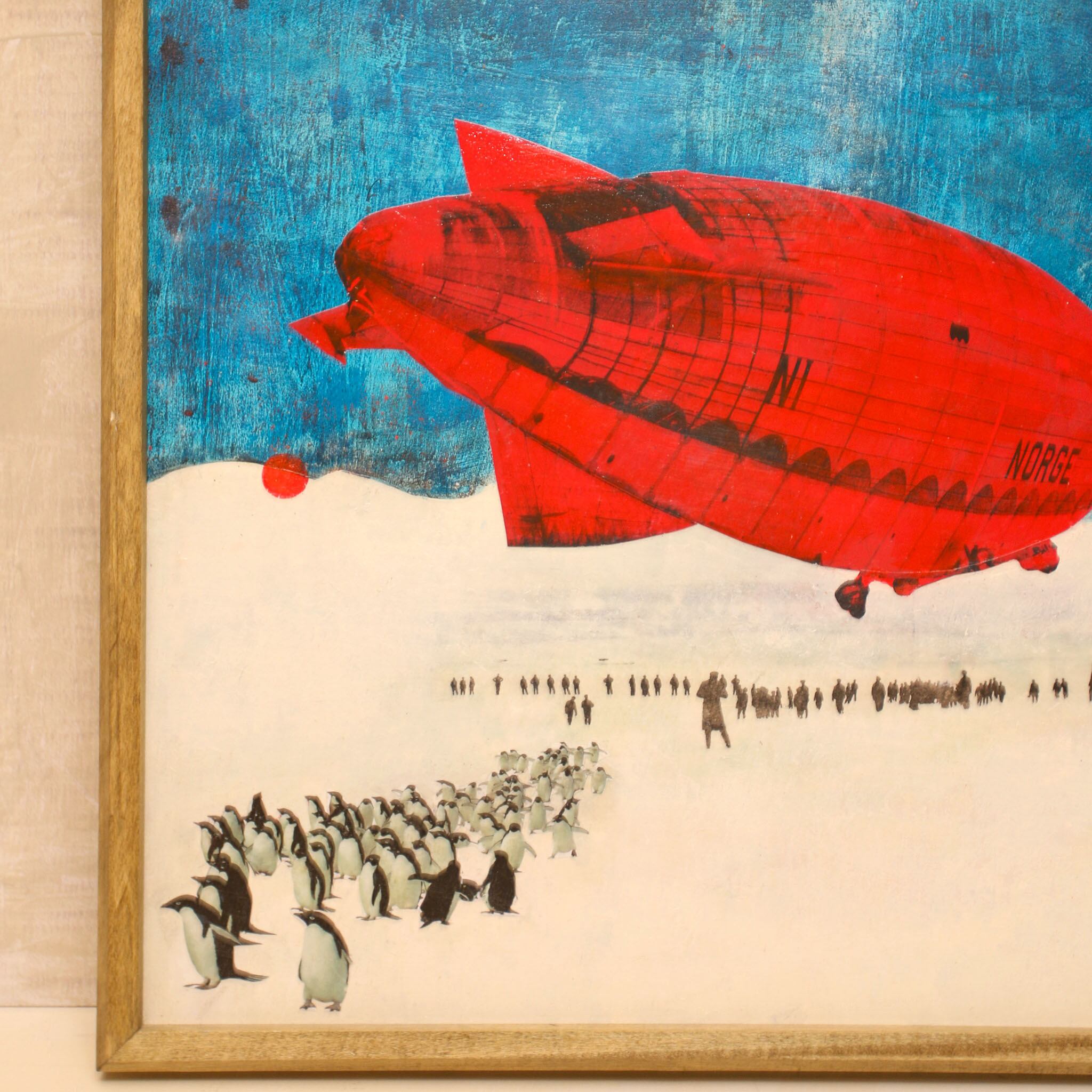 Red Zeppelin No.201は、赤い飛行船と人間がペンギンたちの土地に迫っていくコラージュのアート作品です。大胆な色使いと独創的な構図が目を引き、壁を飾るだけで部屋にアートのエッセンスを加えてくれます。この作品は、一枚で存在感を放つだけでなく、周囲のインテリアとも調和し、空間全体を引き締めてくれることでしょう。