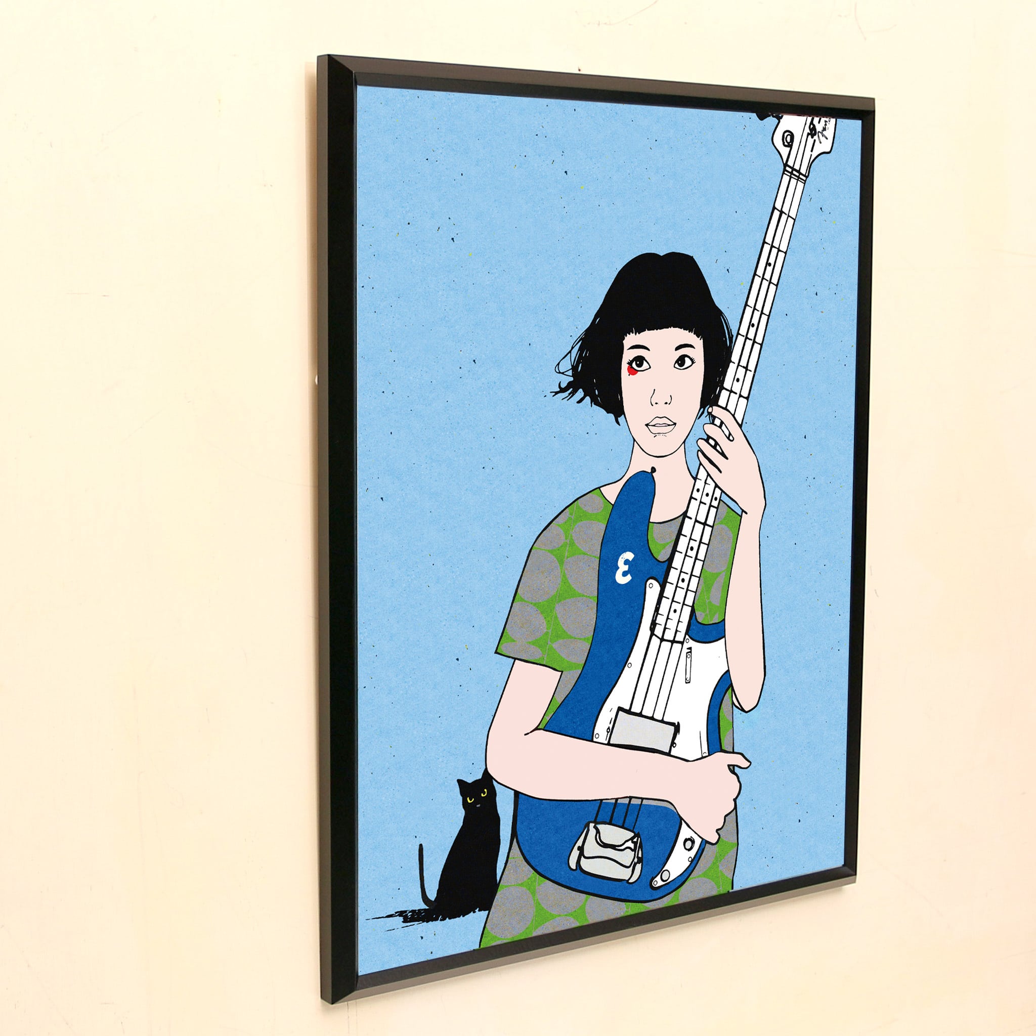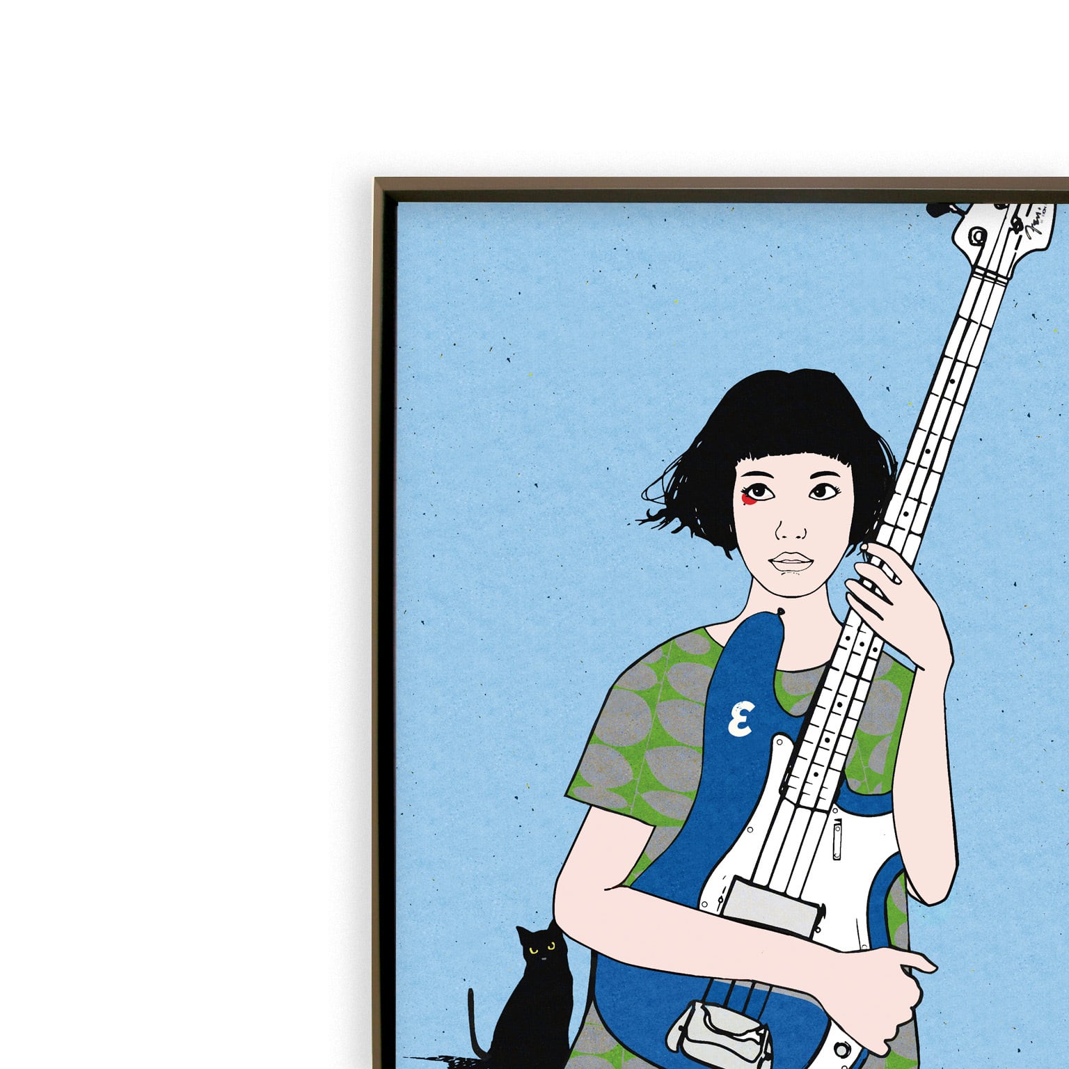 クールな雰囲気を持つ、「Blue base and black cat 」美しい青色をバックに、ベースを抱える少女と、クロネコが描かれたアートイラスト作品です。緻密なタッチで描かれたこの作品は、見る人の心を魅了し、何度も見返したくなること間違いありません。