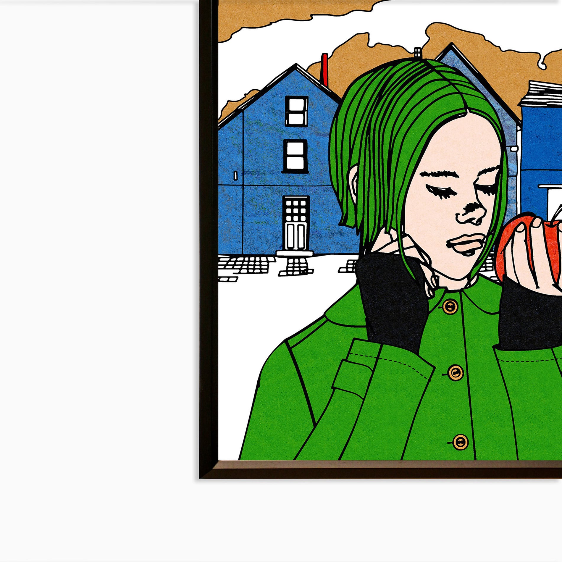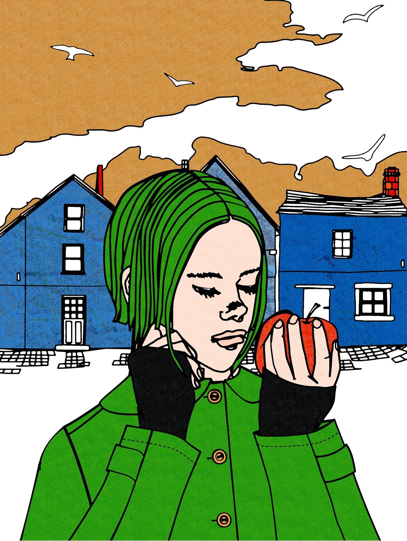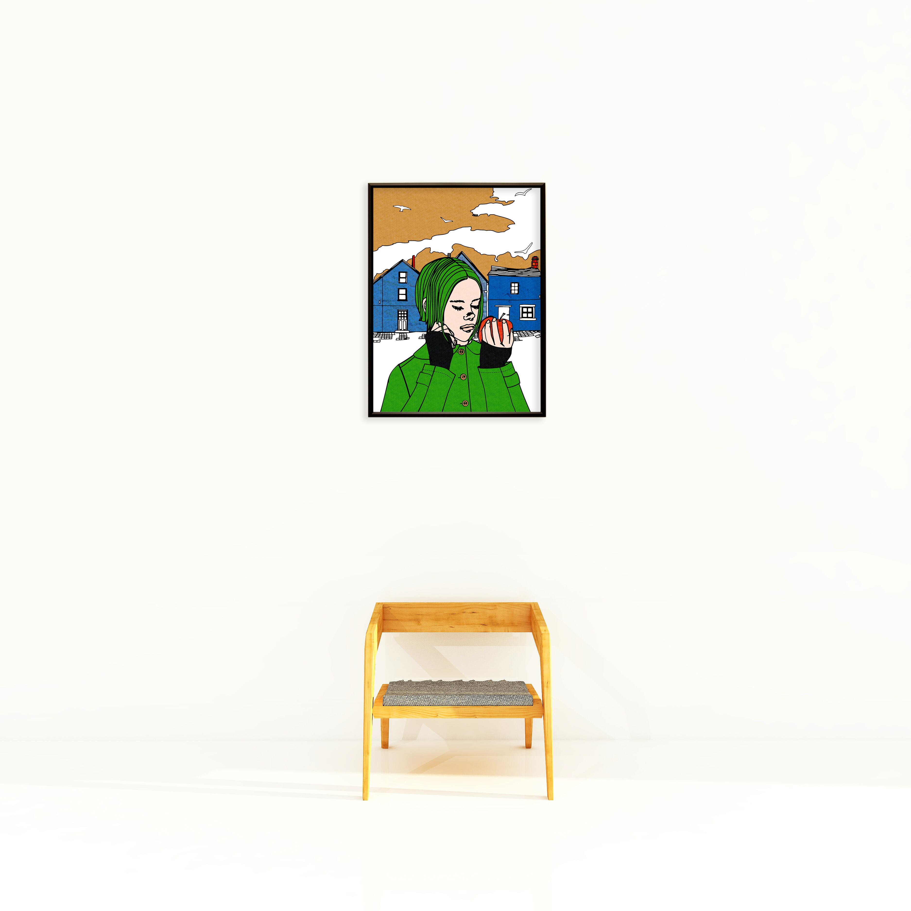 どことなく悲しそうな表情の少女が、りんごを持つグリーンコートのイラストアート。どこか懐かしい感覚を呼び覚ます、心温まる作品です。少女の表情に宿る哀愁のような感情が、鑑賞者の心に深く刺さることでしょう。