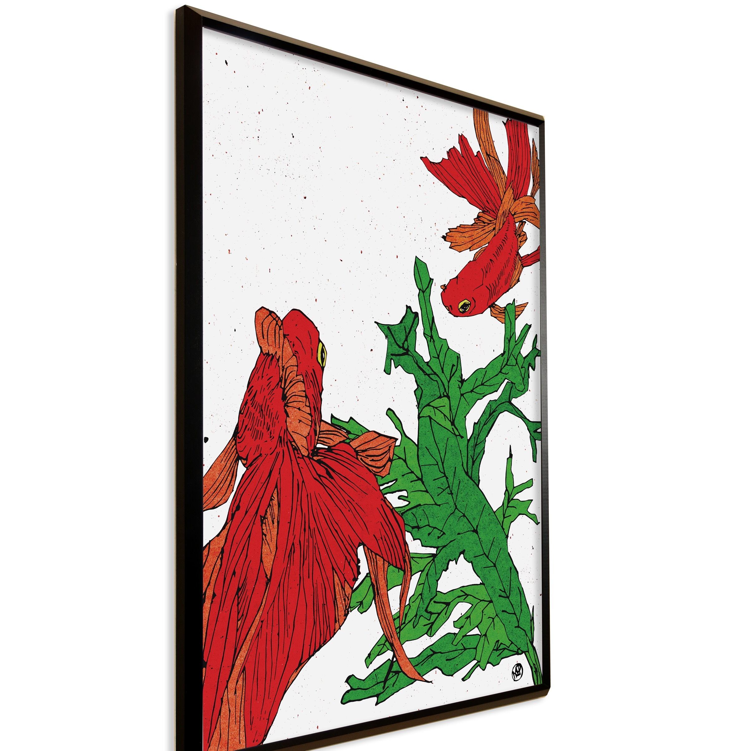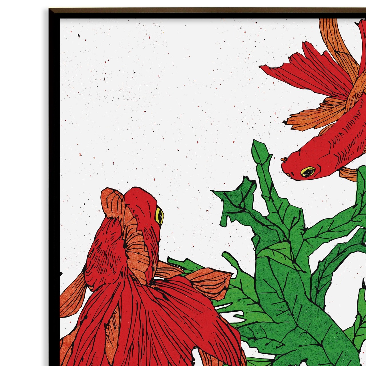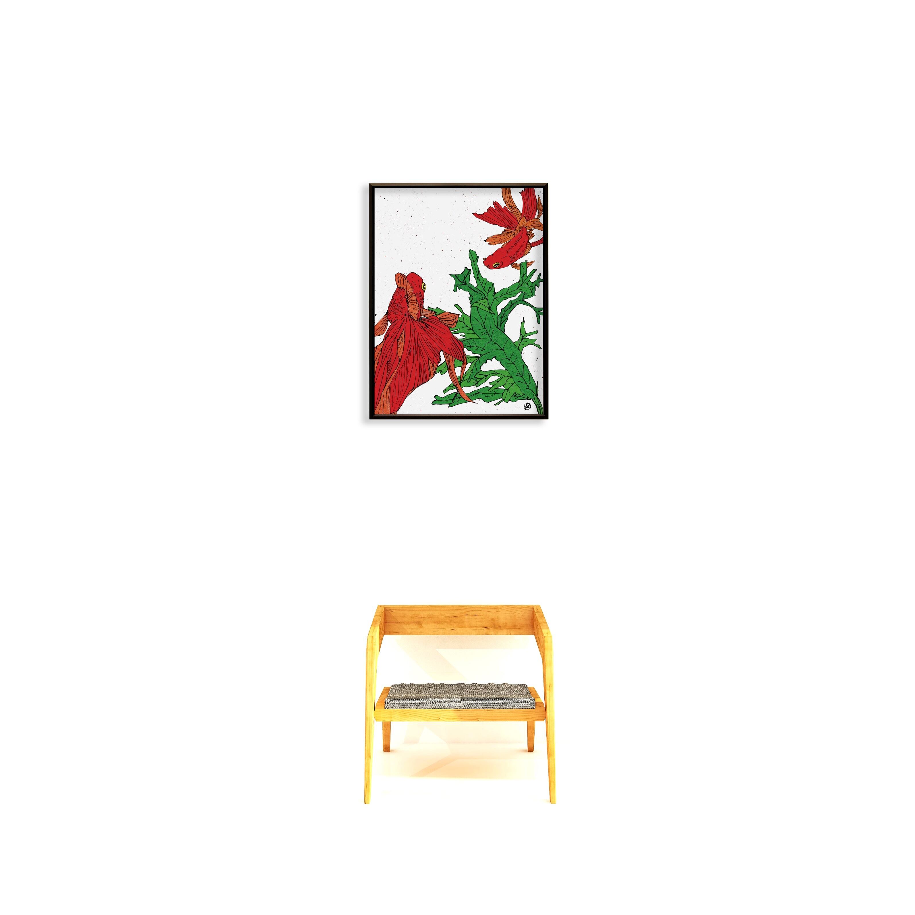 この作品は、まるで日本画の伝統的な構図を彷彿とさせる、シンプルかつ大胆なイラストレーションです。2匹の金魚が対峙する様子が描かれ、互いに向き合う姿が静かに漂う緊張感を生み出しています。鮮やかな赤の色彩と滑らかなラインが、金魚の優雅さと生き生きとした動きを表現しており、視覚的に強く印象を残す一枚です。和の要素を取り入れながらも、現代的アートとしての存在感が際立つこの作品は、和洋を問わず様々な空間に調和します。