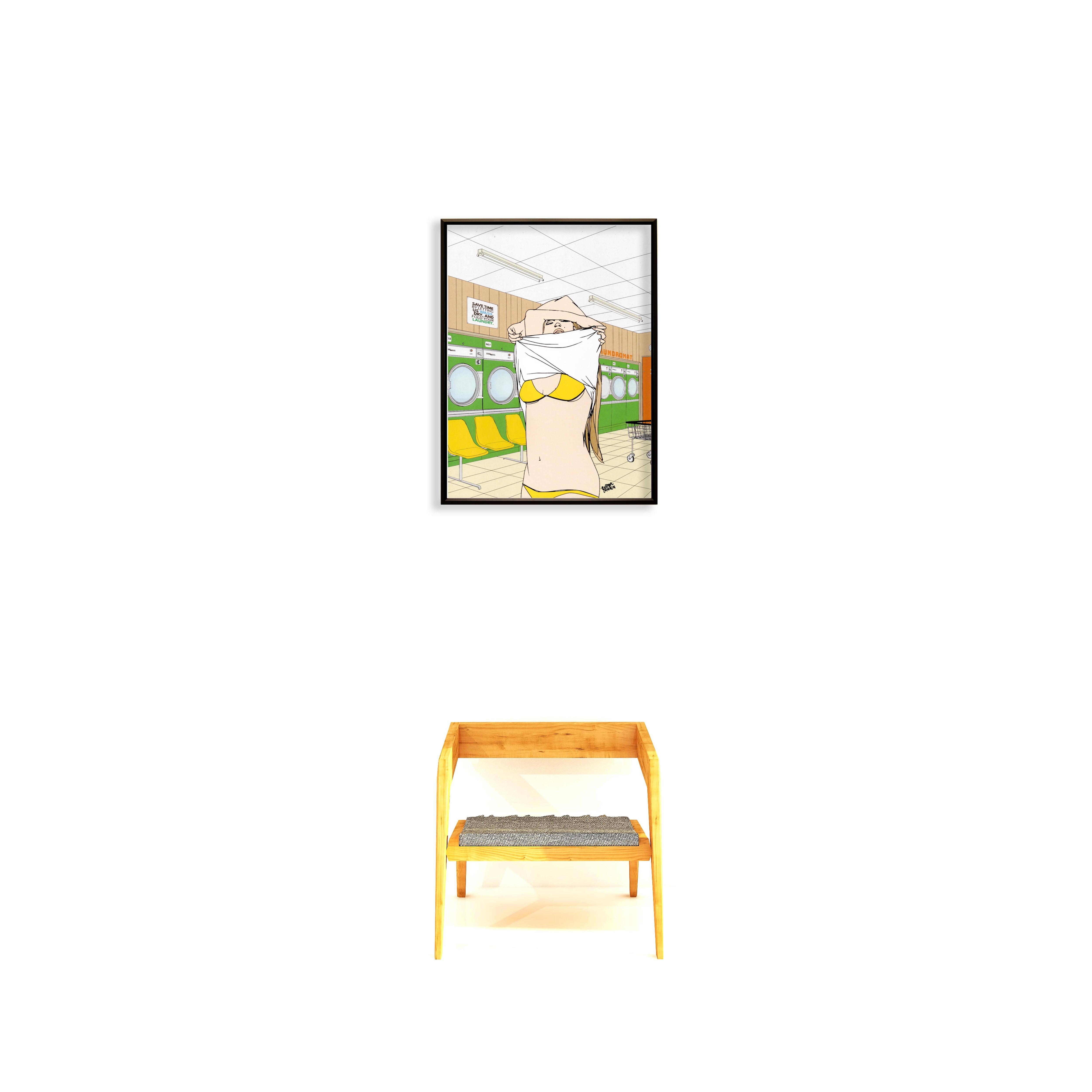 「With love from the laundry」は、日常の風景をセクシュアルな視点とポップな色使いで切り取ったアート作品です。コインランドリーという公共の空間での親密さや自己表現がテーマとなっており、ビビッドな黄色とグリーンのコントラストが視覚的なインパクトを与えます。この作品は、何気ない瞬間を非日常的に感じさせる遊び心と、少しの大胆さがミックスされた現代的な解釈を提供します。
