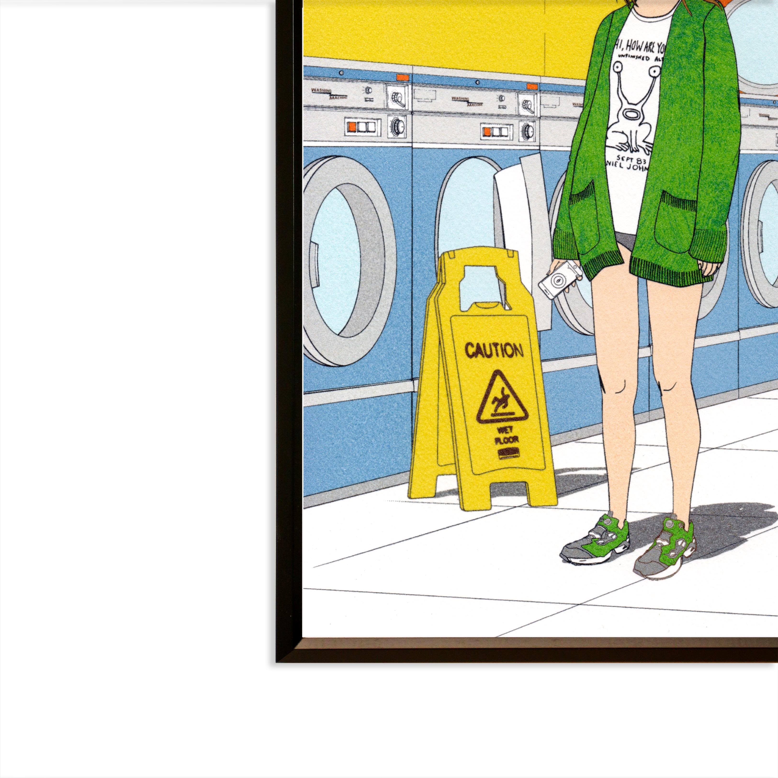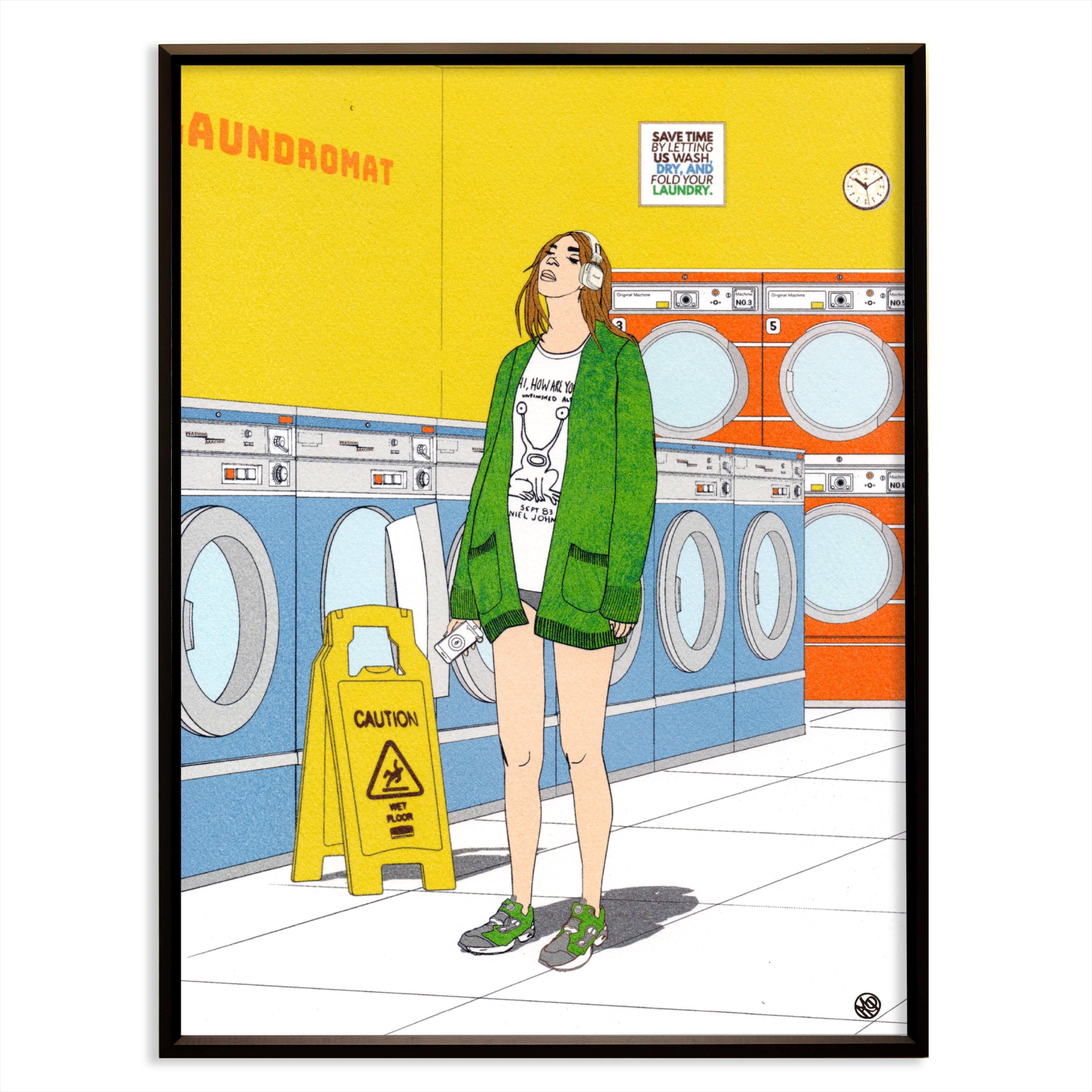 オレンジ、サックスブルーのマシンの配色と鮮やかなイエローの背景が、ランドリーという空間を生き生きと彩り、女性のグリーンのカーディガンが鮮やかに際立ちます。また、「CAUTION」の看板やウォッシャーのディテールなど、小道具がリアリティを加えながらポップアートらしい遊び心をプラスしています。この作品は、観る者に「日常をもっと楽しもう」というメッセージを届けます。
